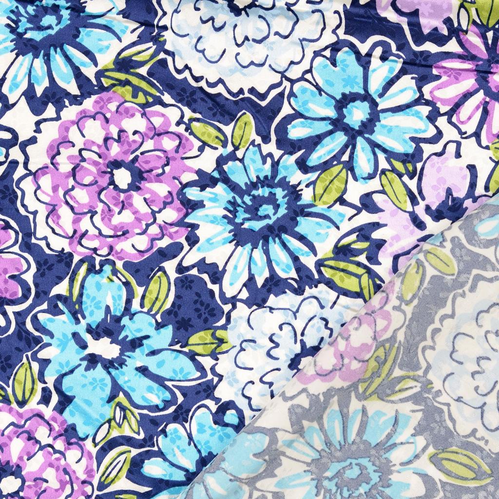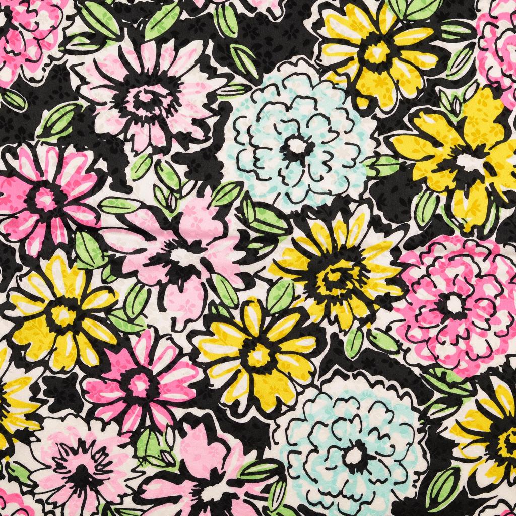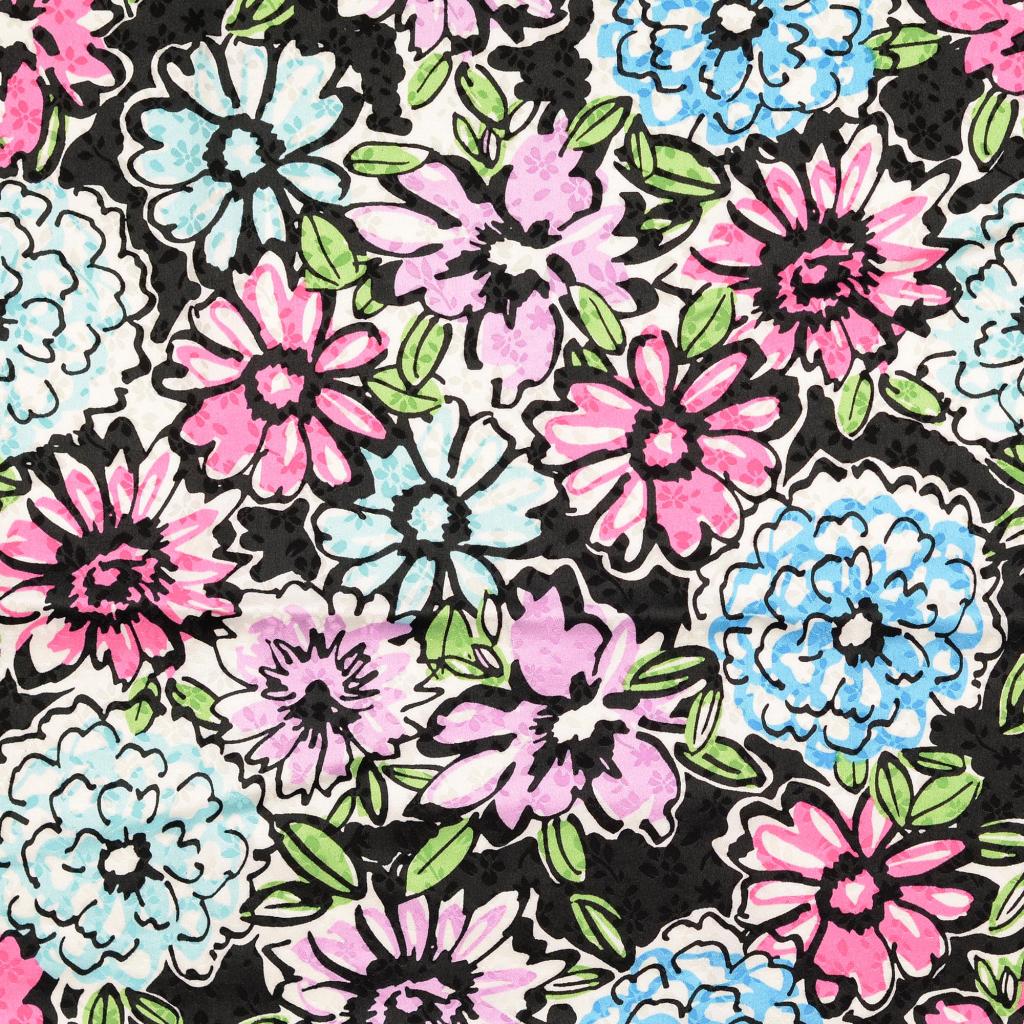 Griffiger Polyester-Satin mit edlem Glanz und buntem Blütenmuster.