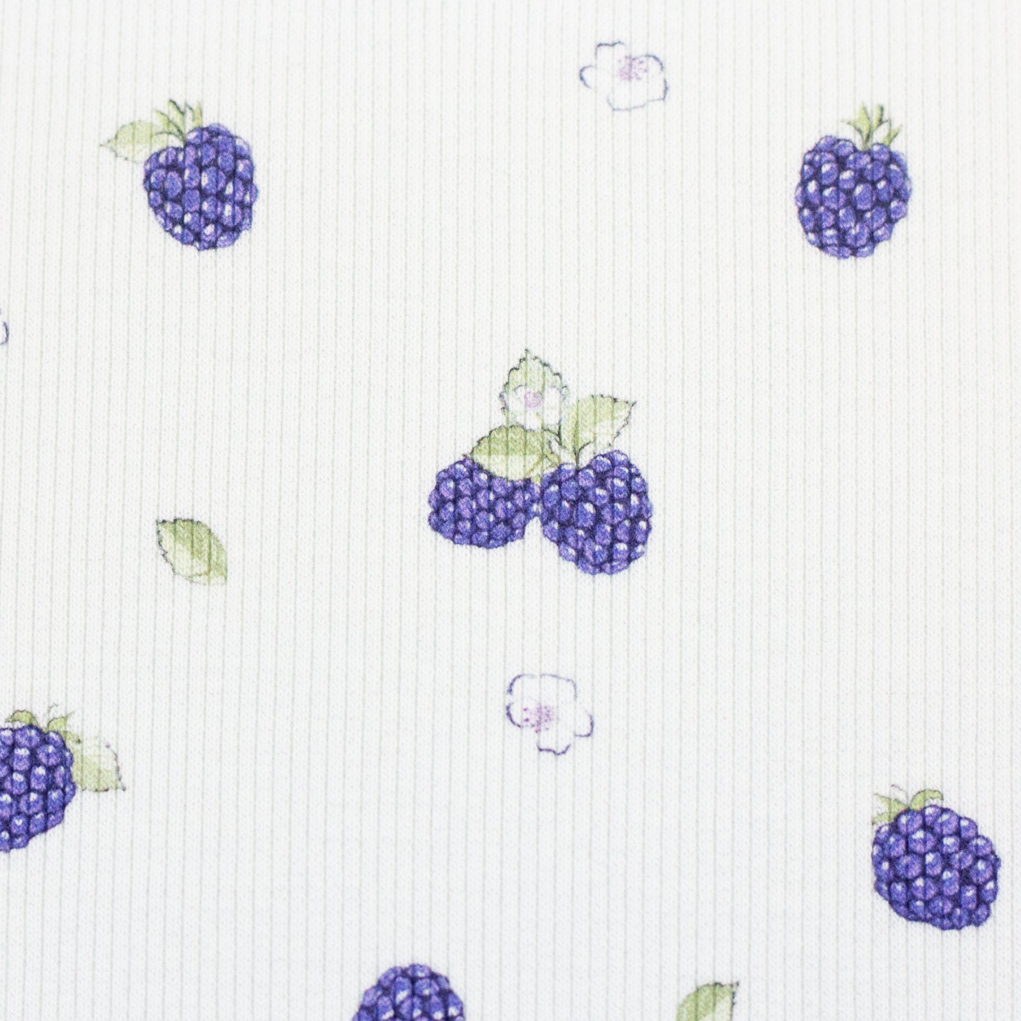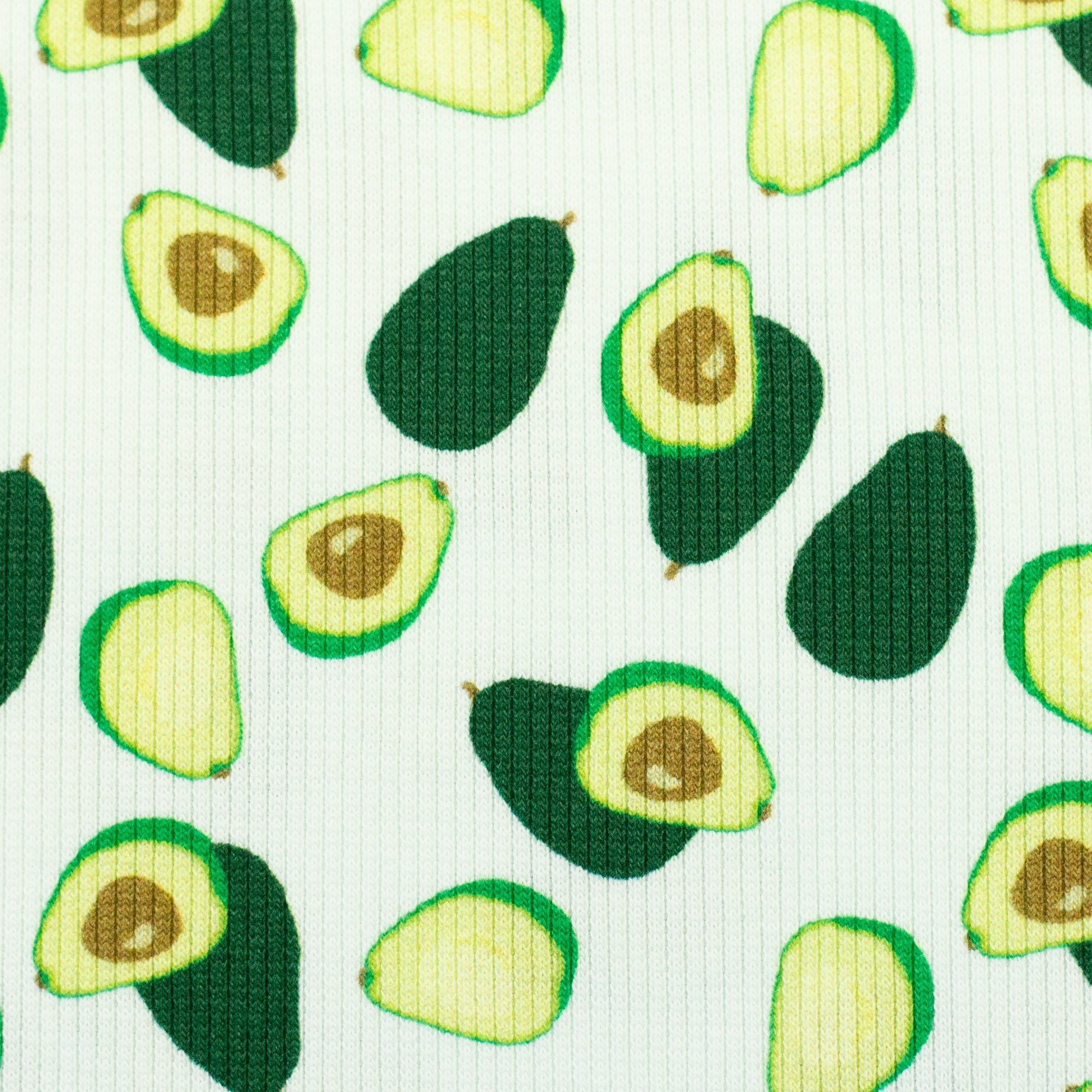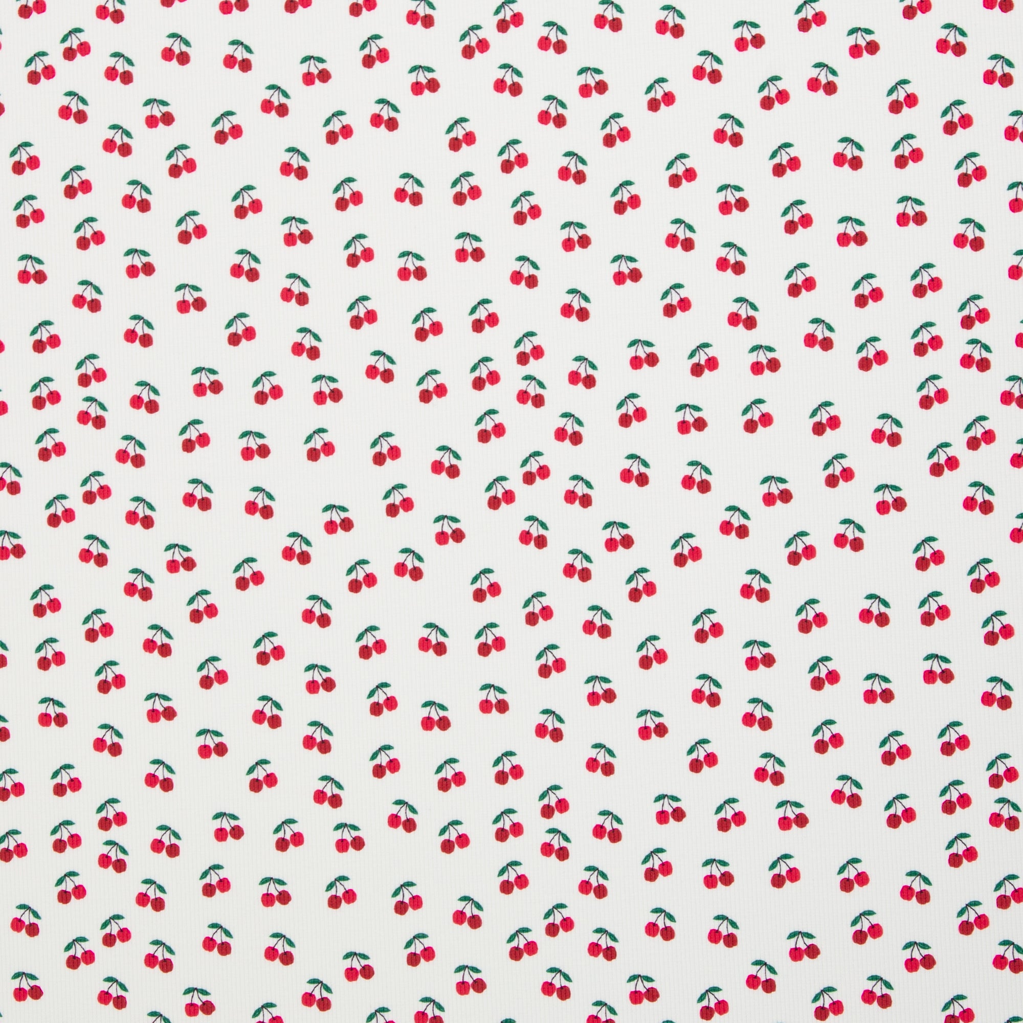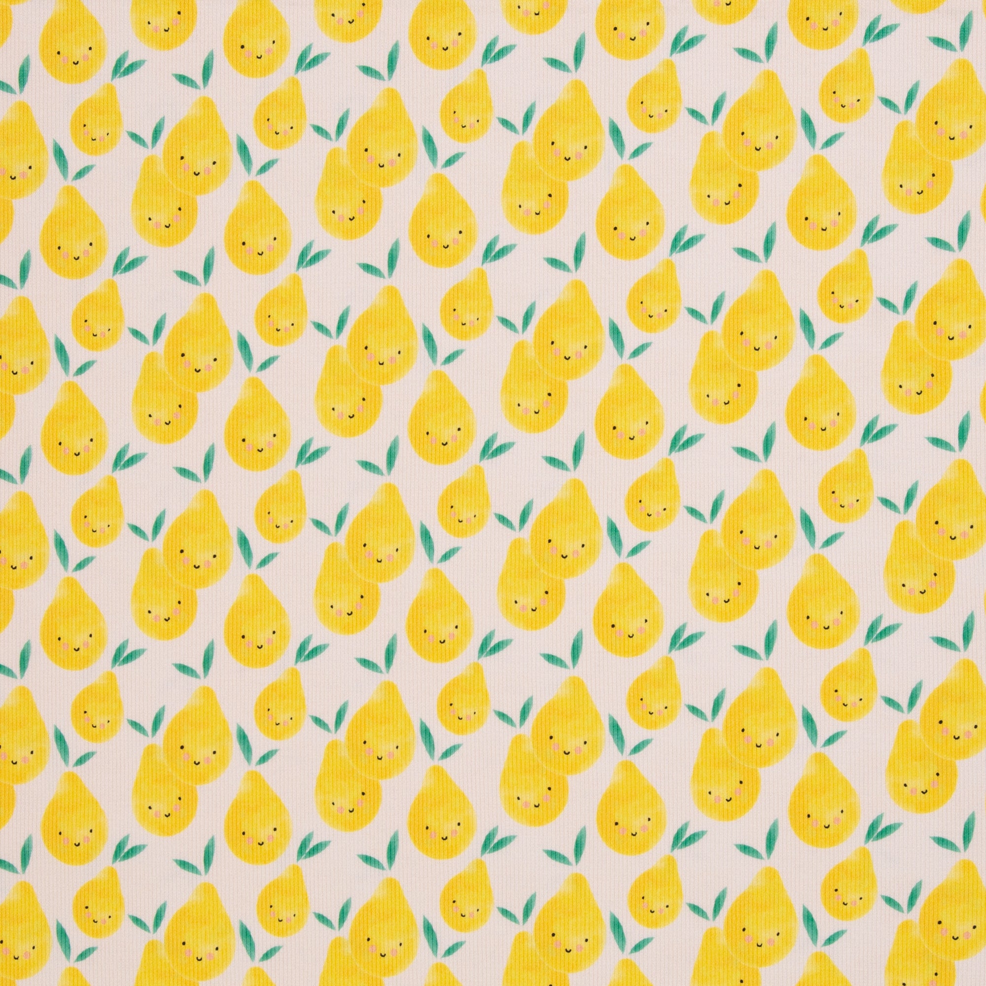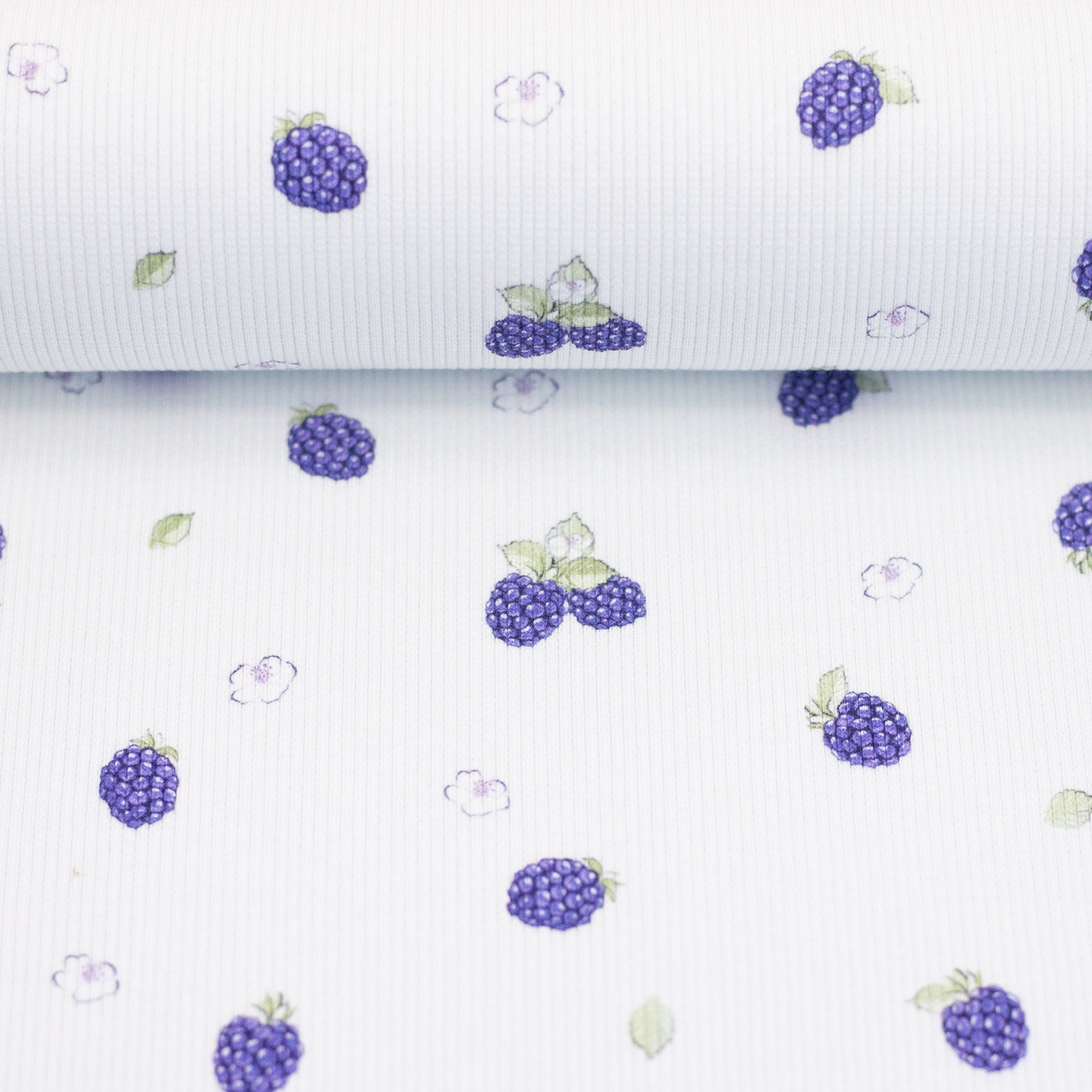 Geseke bringt fruchtige Motive und eine gute Portion Leichtigkeit auf Rippjersey. Kleine, liebevoll illustrierte Brombeeren, Kirschen, Avocados, Zitronen, Erdbeeren und Wassermelonen verteilen sich gleichmäßig über den Stoff und sorgen für ein ruhiges, harmonisches Gesamtbild.