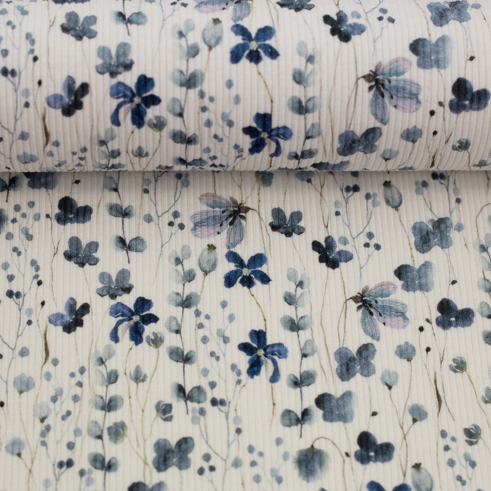 Unser Rippjersey Mia überzeugt mit einer sehr schönen Qualität und einem angenehm weichen Fall. Das neue Design zeigt filigrane Blüten und zarte Zweige, die sich leicht und verspielt über den naturfarbenen Untergrund ziehen.