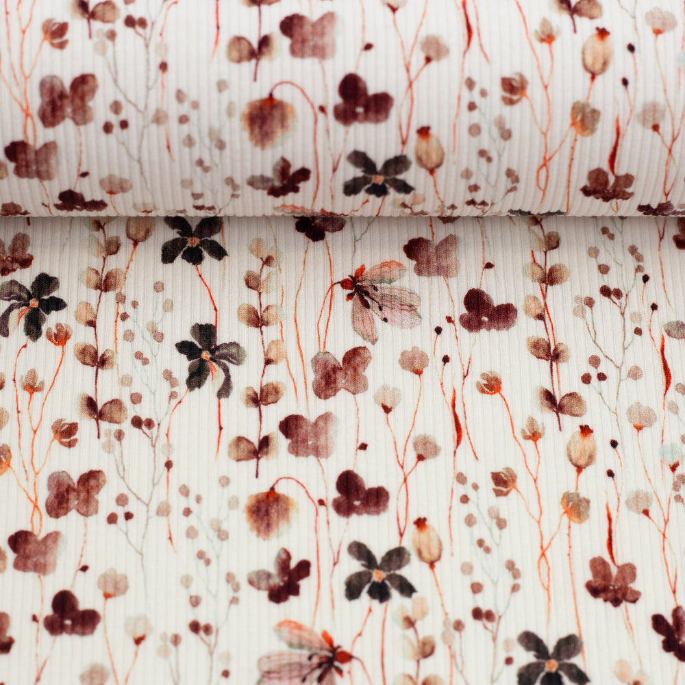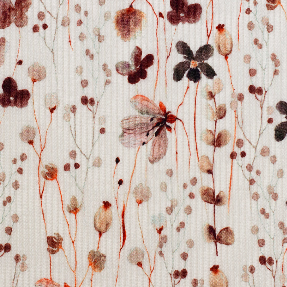 Unser Rippjersey Mia überzeugt mit einer sehr schönen Qualität und einem angenehm weichen Fall. Das neue Design zeigt filigrane Blüten und zarte Zweige, die sich leicht und verspielt über den naturfarbenen Untergrund ziehen.