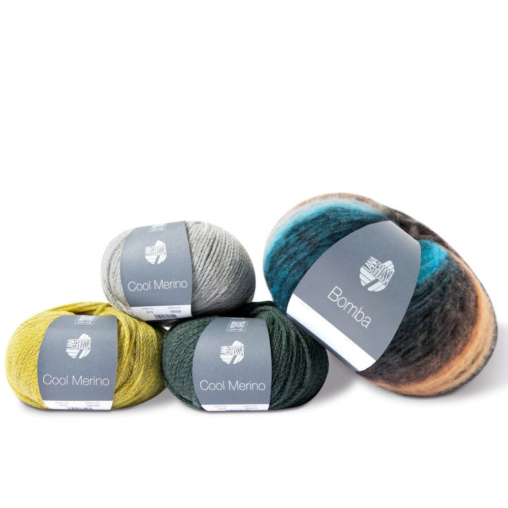 Material Bomba: 85%Schurwolle 15%Polyamid ca.290m Lauflänge , Cool Merino: 90% Schurwolle 10%Polyamid ca.150m Lauflänge