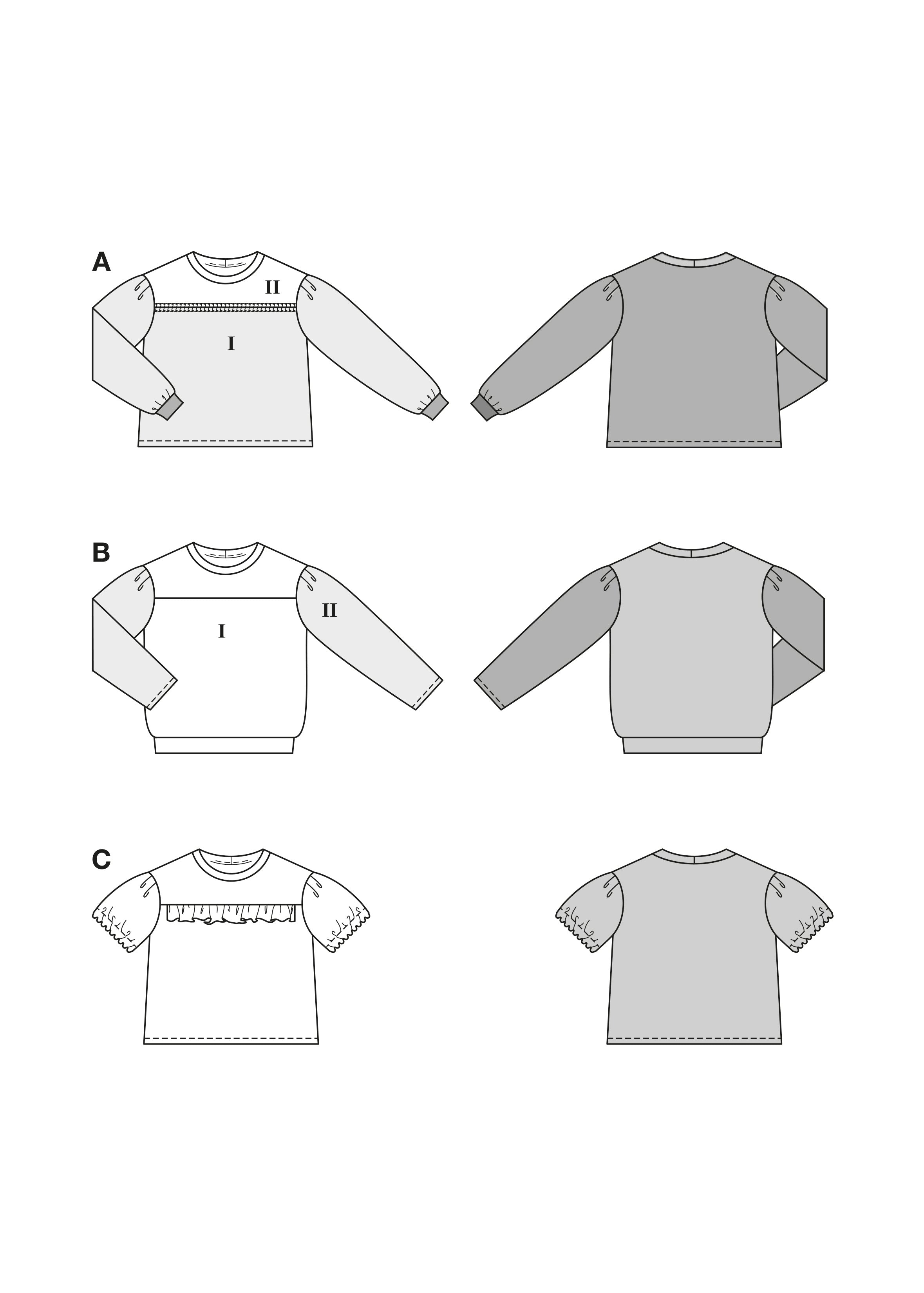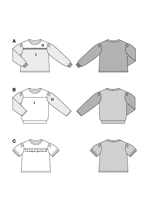 Vervollständige deinen Casual- und Streetstyle-Look mit diesen drei Langarmshirts! Die erste Variante kombiniert zwei verschiedenfarbige Stoffpartien, Rüschen, Fertigbündchen und Bienen-Applikationen zu einem lässig-eleganten It-Piece. Die zweite begeistert mit samtweichem Nickistoff, langen Ärmeln aus Printstoff und funkelnder DIY-Bienenbrosche. Die dritte, ein Strick-Sweater, setzt auf Gegensätze: vorne zarte Rüsche, hinten auffälliger Tiger-Patch. Perfekt für coole Layering-Looks oder solo getragen!