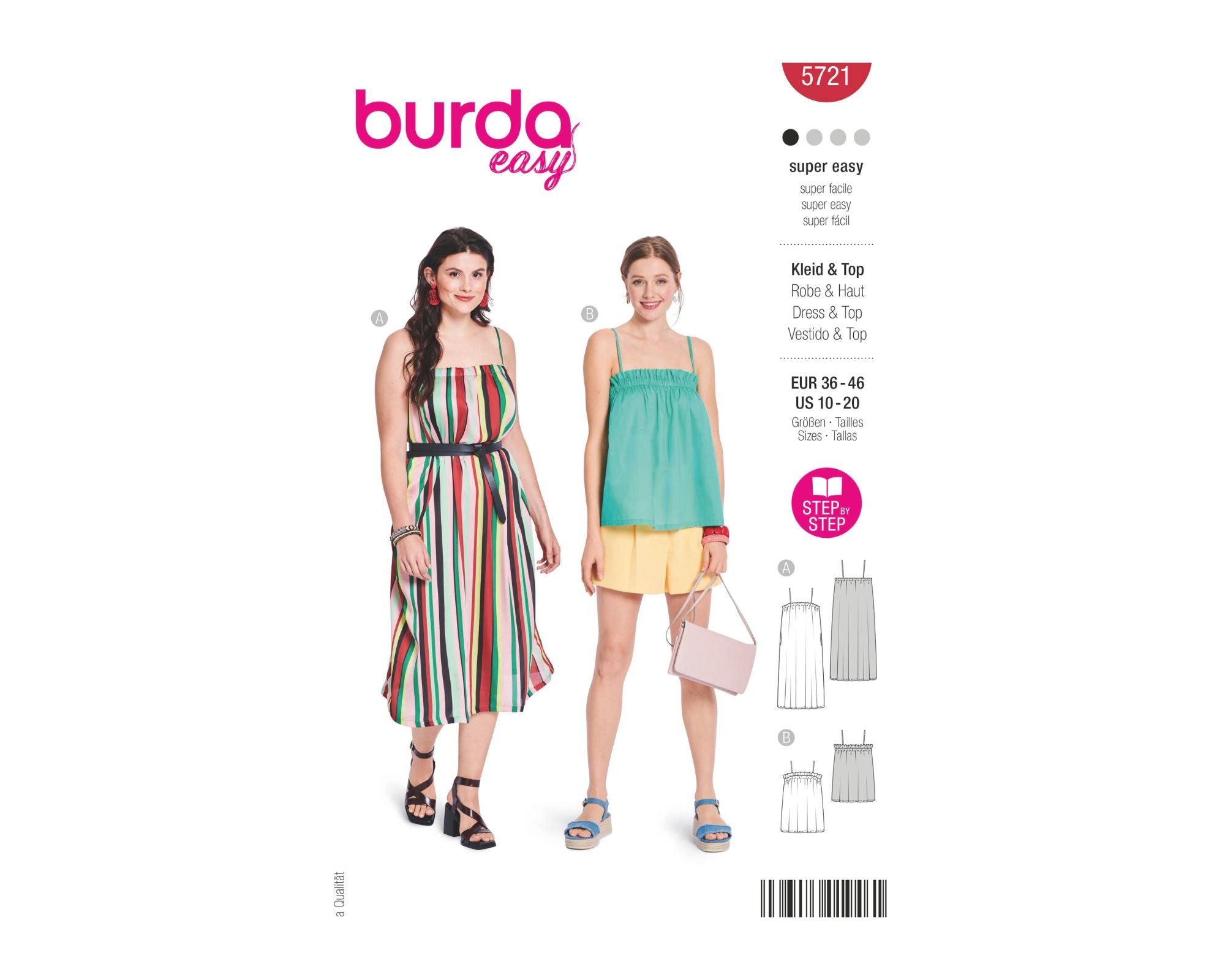 Dieses vielseitige Kleid- und Top-Schnittmuster von burda easy ist perfekt für Anfänger. Das Trägerkleid mit Nahttaschen passt sich mühelos jedem Anlass an – ob als luftiger Strandbegleiter oder schick gestylt für eine Cocktailparty. Einfach kürzen oder verlängern, je nach Vorliebe! Die zweite Variante, ein Top mit gesmoktem Ausschnitt und Spaghettiträgern, ist schnell genäht und eignet sich für edle Seide oder leichte Sommerstoffe.