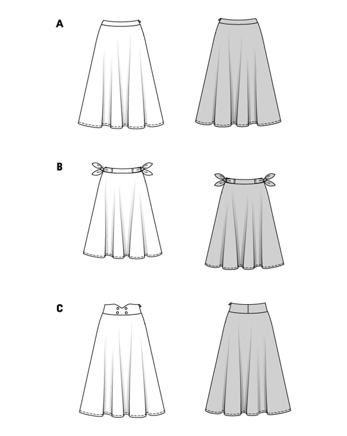 Entdecke die neuesten Rock-Schnittmuster für Nähanfänger! Variante 1 bietet einen schwingenden Rock, perfekt für Tanzstunden. Variante 2 vereint French Chic und Rockabilly mit einem knielangen Vichy-Karo-Rock und Schleifen am Bund. Variante 3 zaubert eine elegante Silhouette mit einem langen Glockenrock aus Jacquard-Denim, breitem Bund und Knöpfen – ideal für besondere Anlässe! Nähe diese Röcke aus Rockstoffen mit etwas Stand.