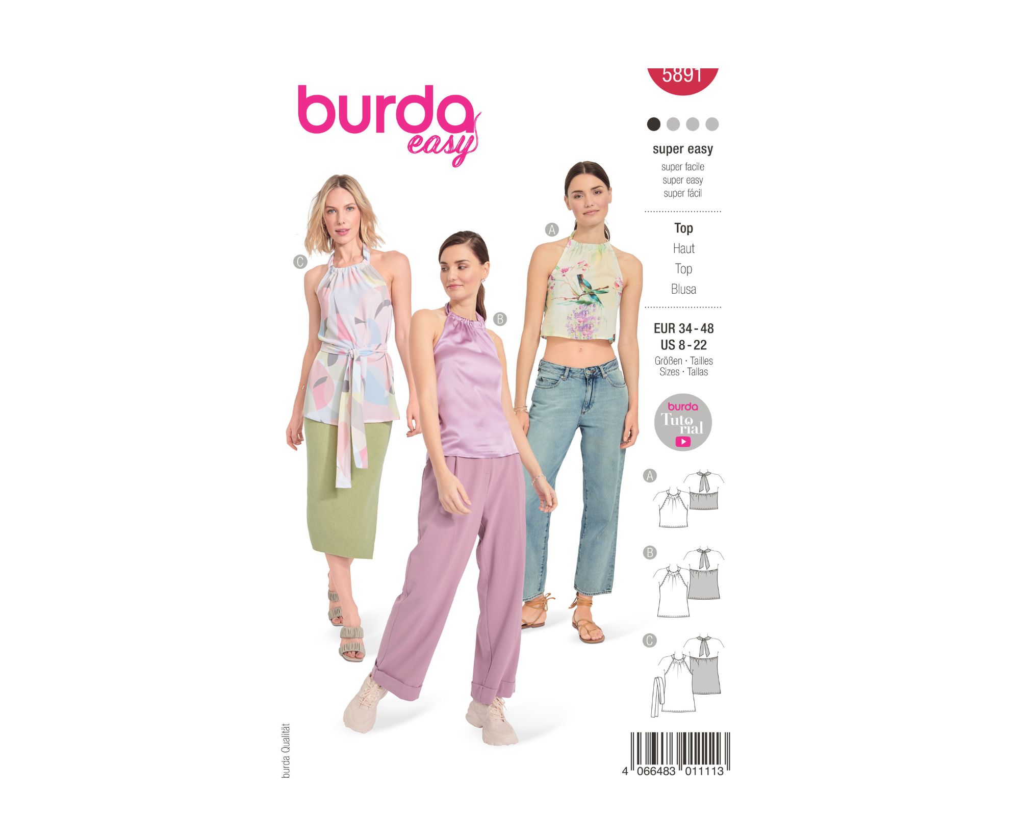 Tolle Neckholdertops in drei verschiedenen Längen. A leicht gecropt, B in normaler Länge, C gut hüftlang und mit Bindegürtel. Alle drei mit Gummizug im Rückenteil für einen guten Halt und einem Band aus demselben Stoff, der das Vorderteil rafft und im Nacken geknotet wird.