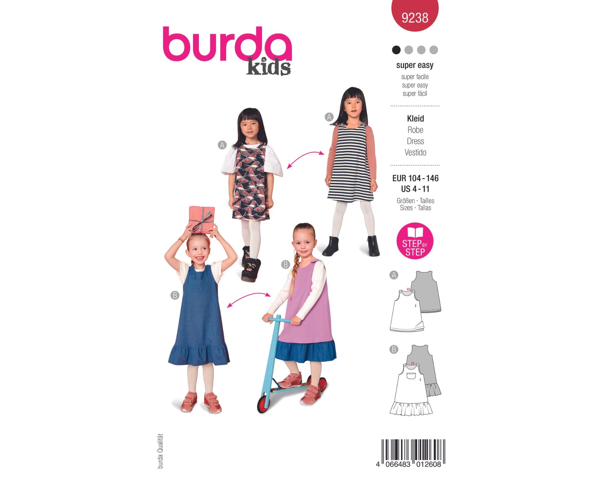 Diese unkomplizierten bequemen Kleider lieben kleine Mädchen. Die leicht ausgestellten Modelle sind so verarbeitet, dass sie auch gewendet werden können und somit ein ganz anderer Look entstehen kann. B wird mit einer breiten Saumrüsche richitg romantisch.
