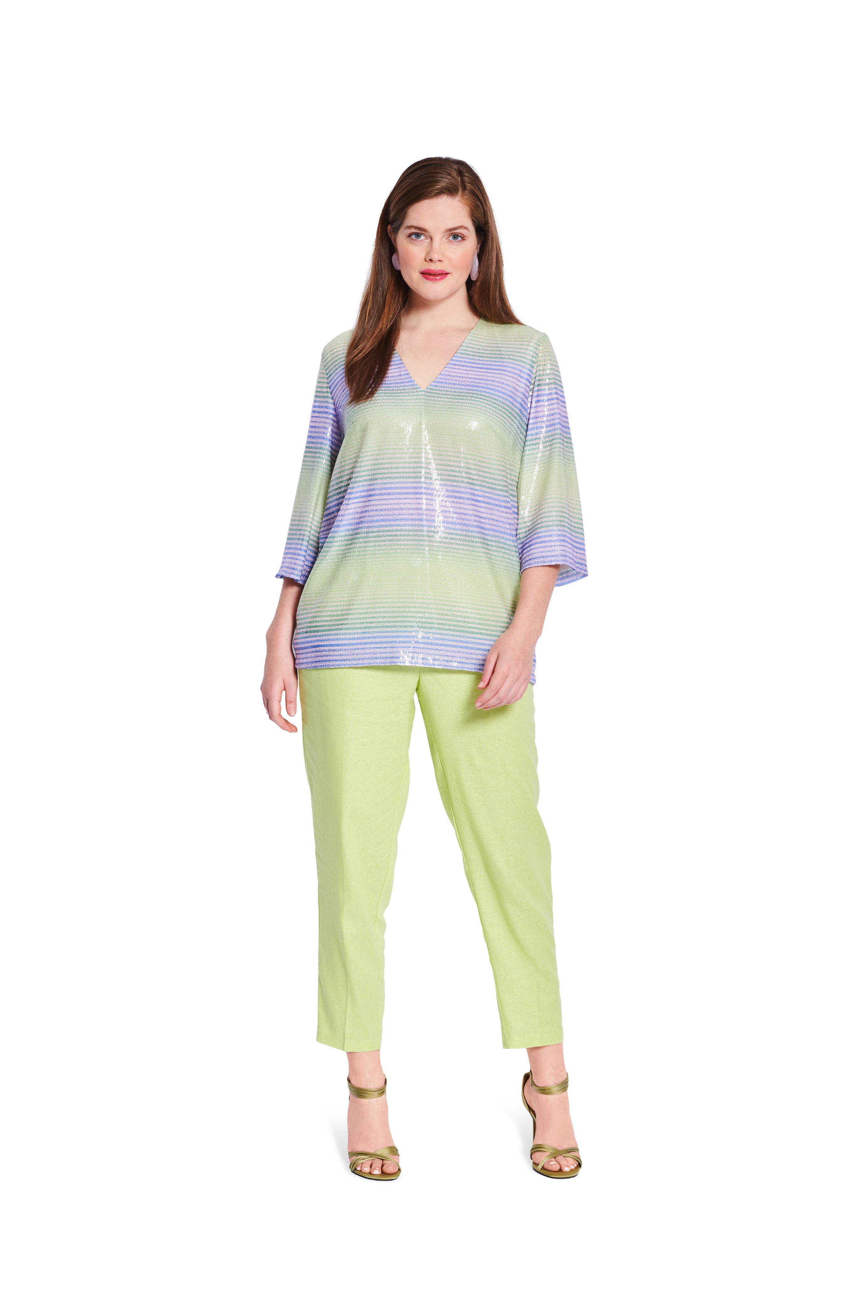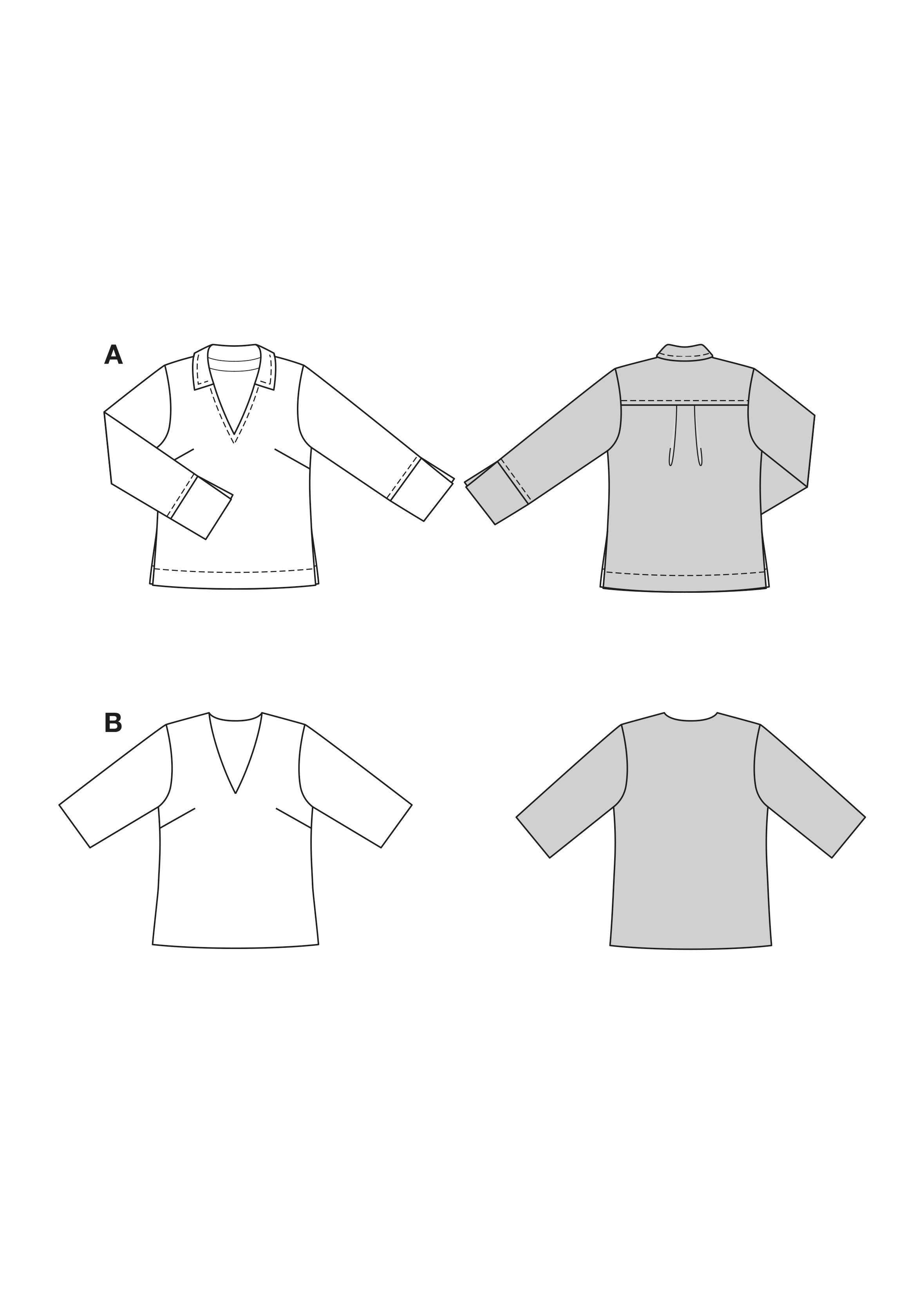 Moderne Basics mit besonderen Akzenten: Die erste Bluse überzeugt mit breiten Ärmelaufschlägen statt klassischer Manschetten und einem V-Ausschnitt statt Knopfleiste. Das zweite Shirt bringt Alltagstauglichkeit und Glamour zusammen – tiefes V, 3/4-Ärmel und unkomplizierter Schnitt machen Pailletten alltagstauglich.