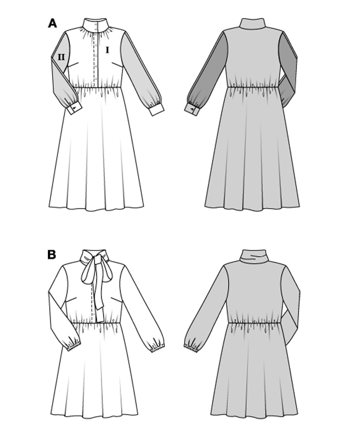 Dieses anspruchsvolle Kleider-Schnittmuster kommt in zwei Varianten. Modellvariante 1 kombiniert sportlichen und femininen Stil mit Stehkragen, verdeckter Knopfleiste und Glockenrock. Farbige Streifen durch Color-Blocking setzen Akzente. Schnitt-Variante 2 ist vielseitig: Mit Schluppe und Gummizug in der Taille ist es ideal für Dinner, Büro oder Party.