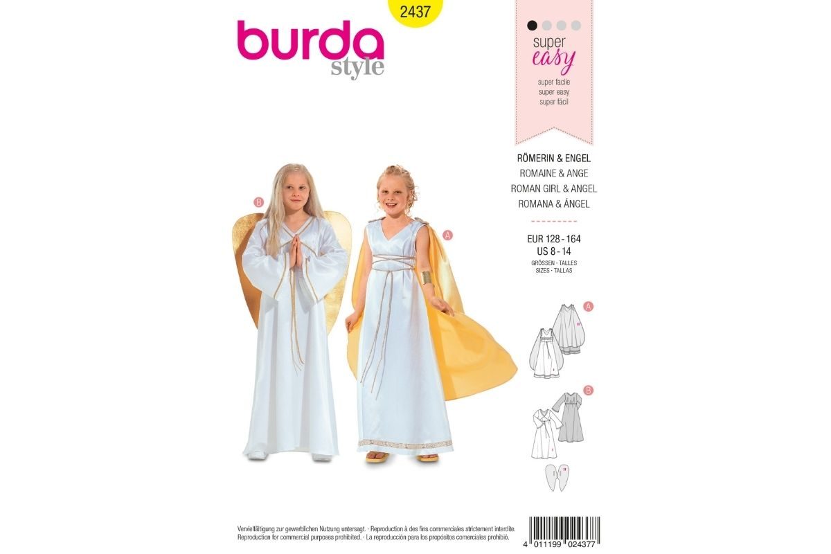 Die beiden Faschingskostüme für Kinder bestehen aus bodenlangen Kleidern. Ärmelloses Kleid mit Schnürung für die Römerin A. Das Cape wird einfach an der Schulter festgesteppt. Kleid B für den Engel, mit langen, ausgestellten Ärmeln, ist mit Goldborte verziert. Die Flügel sind mit Klettband am Rückenteil befestigt und können abgenommen werden.