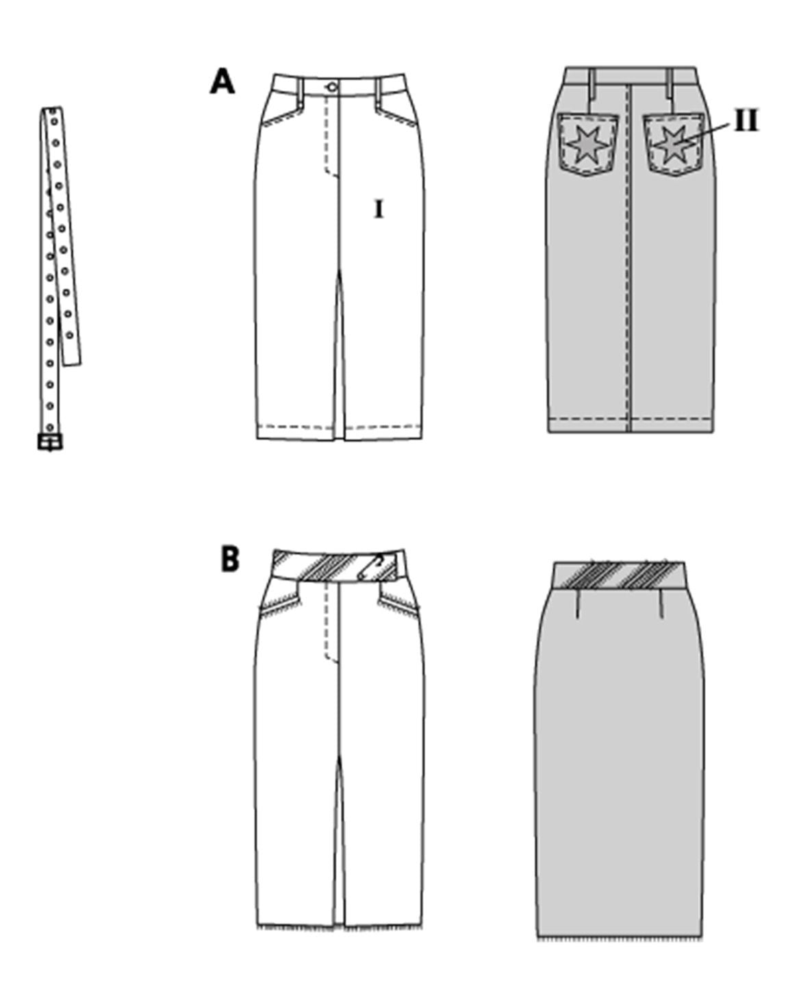 Dieses Rock-Schnittmuster bedarf etwas Näherfahrung und bietet zwei stilvolle Varianten. Der erste Rock kombiniert den rockigen Jeanslook mit edlen Details – Sterne auf den Taschen, ein extralanger Gürtel mit Ösen und ein figurbetonter Schnitt mit Schlitz. Die zweite Variante kombiniert Jeansrock und Kilt-Look: Ein schmaler Midirock mit Schlitz und Fransen, der eine tolle Figur macht. Zwei vielseitige Röcke für moderne Looks!