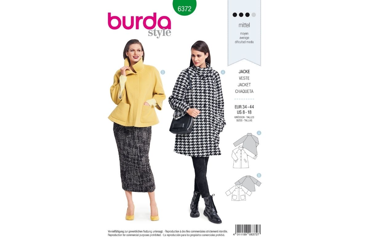 Zwei Jacken-Schnittmuster in leichter A-Linie. Ein Kurzmantel mit Stehkragen und Riegeln an den Ärmeln und eine kurze, kastige Jacke. Beide haben Raglanärmel und Brustabnäher.