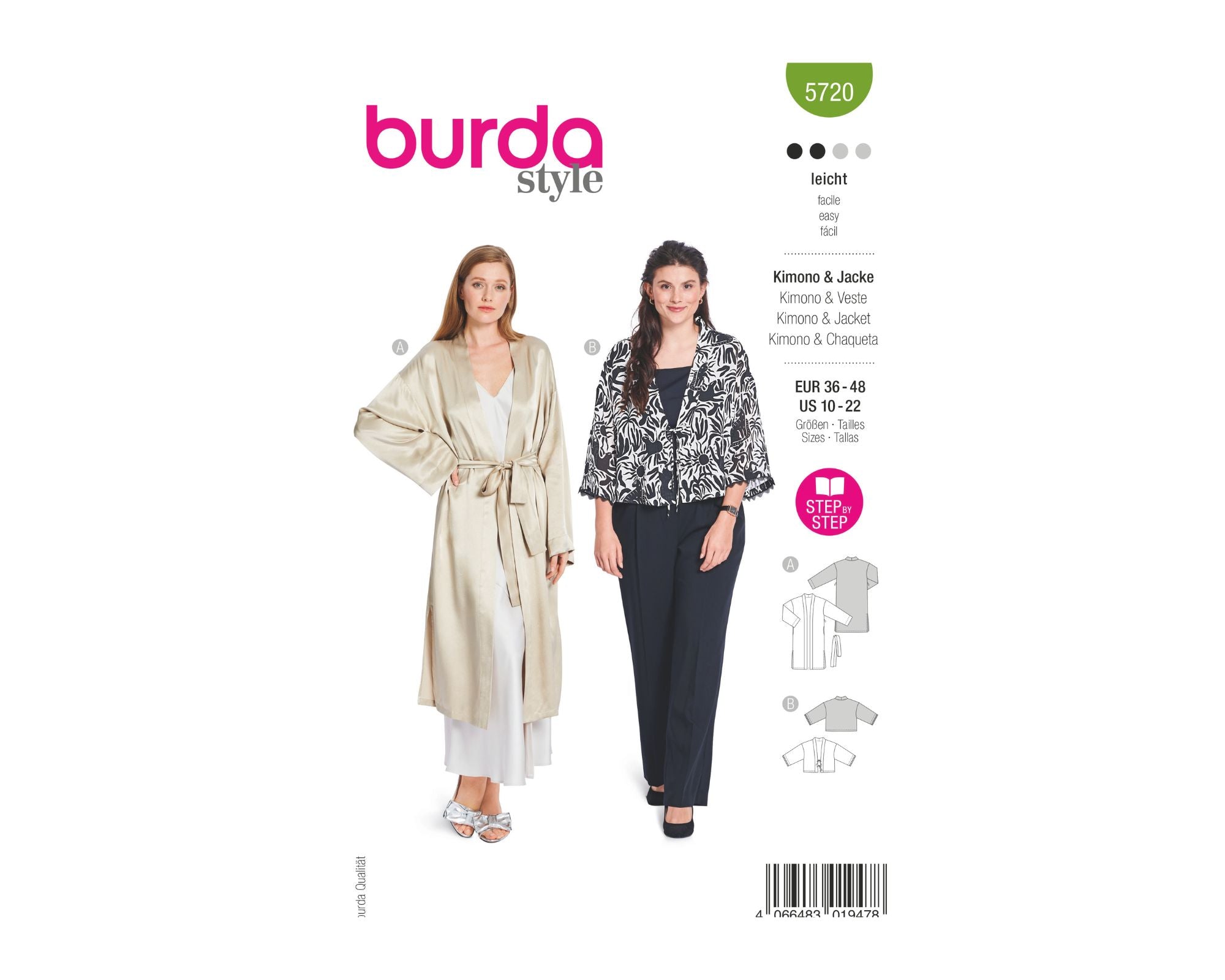 Verwöhne dich mit diesem eleganten Kimono- und Jacken-Schnittmuster von burda style! Der luxuriöse Morgenmantel mit tief eingesetzten Ärmeln und Bindeband schmeichelt der Haut, besonders aus edlem Satin. Fashionistas stylen ihn auch tagsüber als Cardigan-Ersatz. Die zweite Variante, eine dramatische Jacke mit weiten Ärmeln, ist perfekt für üppige Outfits und wird mit Schleifen oder Posamentenverschlüssen geschlossen.