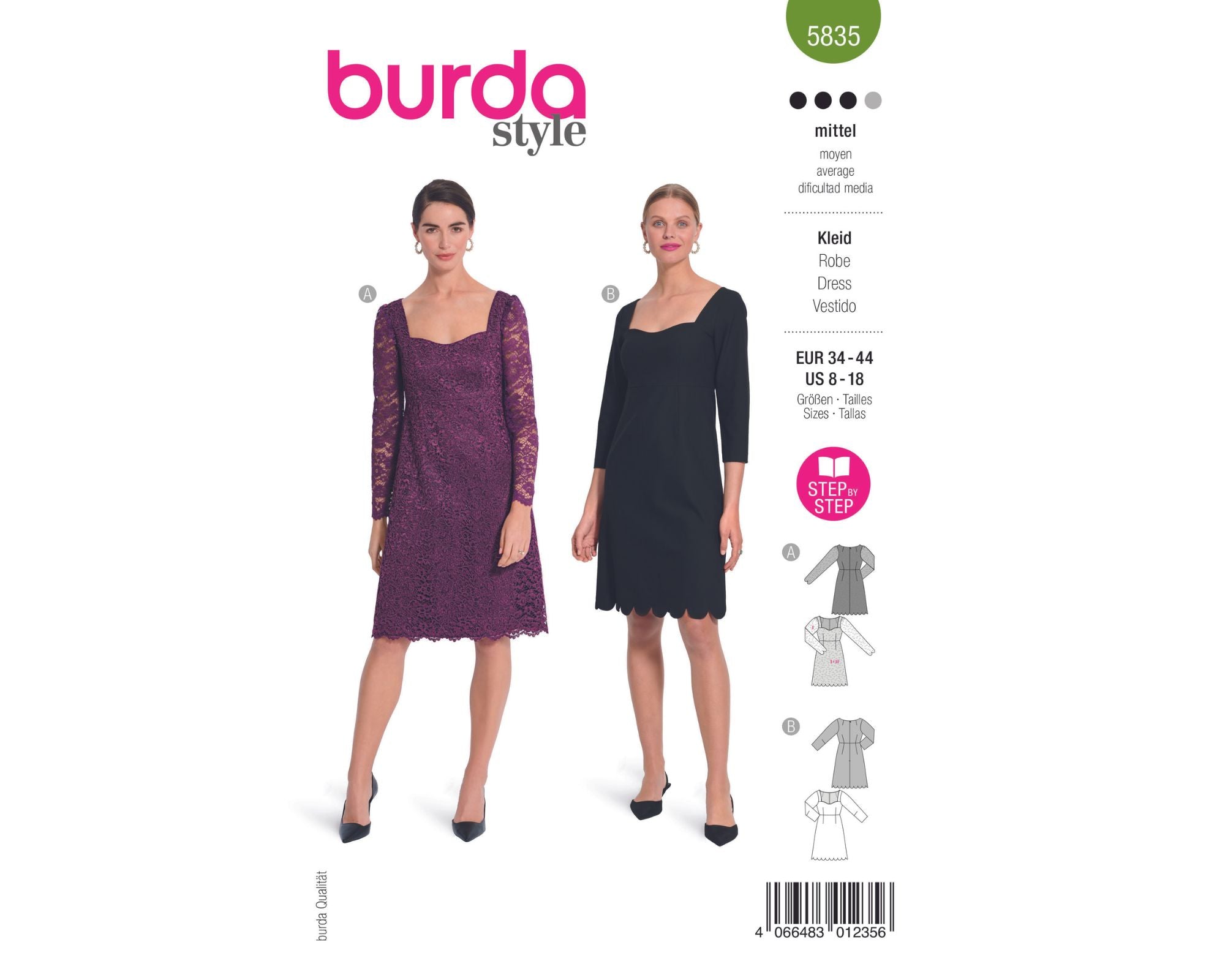 Cockailkleider nach einem Schnitt, beide mit schön geformtem Ausschnitt in schmaler Silhouette mit leicht ausgestelltem Rock und gebogter Saumkante. Bei Kleid A kommt Spitzenstoff zum Einsatz, der an den Ärmeln, die nicht unterlegt werden, eine schöne Transparenz ergibt.