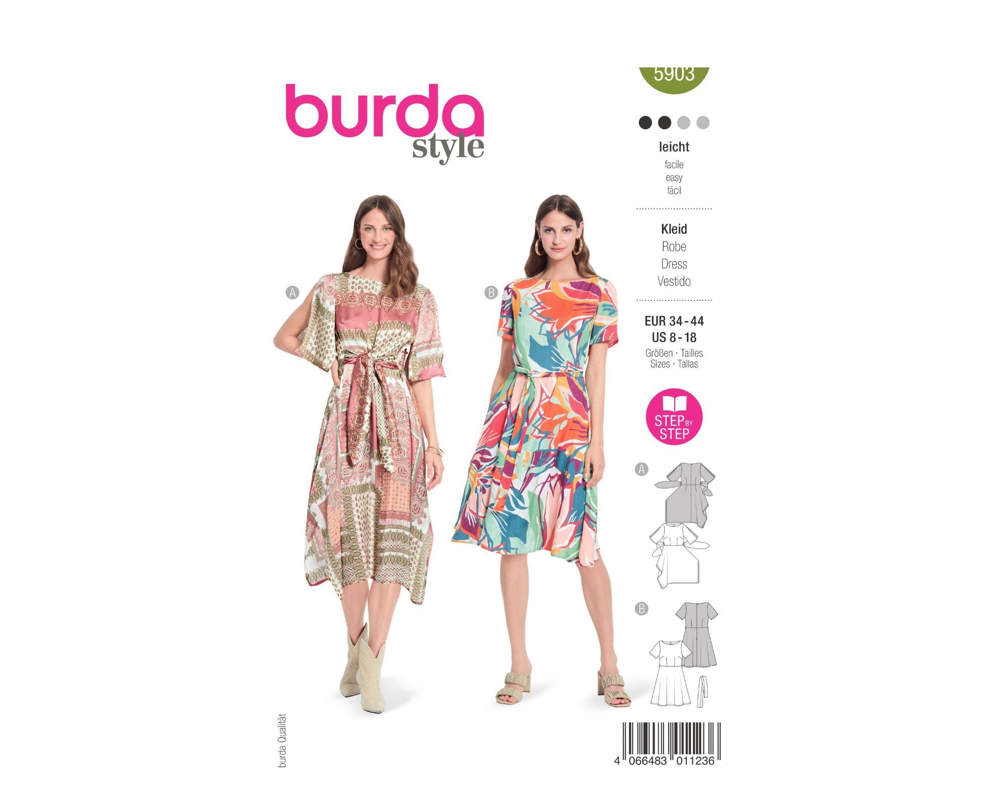 Unkompliziert zu Tragen und zu Nähen sind diese luftigen Kleider die angesagte Prints bestens zur Geltung bringen. A mit raffiniertem Zipfelrock, oben geschlitzten Ärmeln und Bindebändern in der Taille. B schlichter mit ausgestelltem Rock, kurzen Ärmeln und Extra-Bindegürtel.