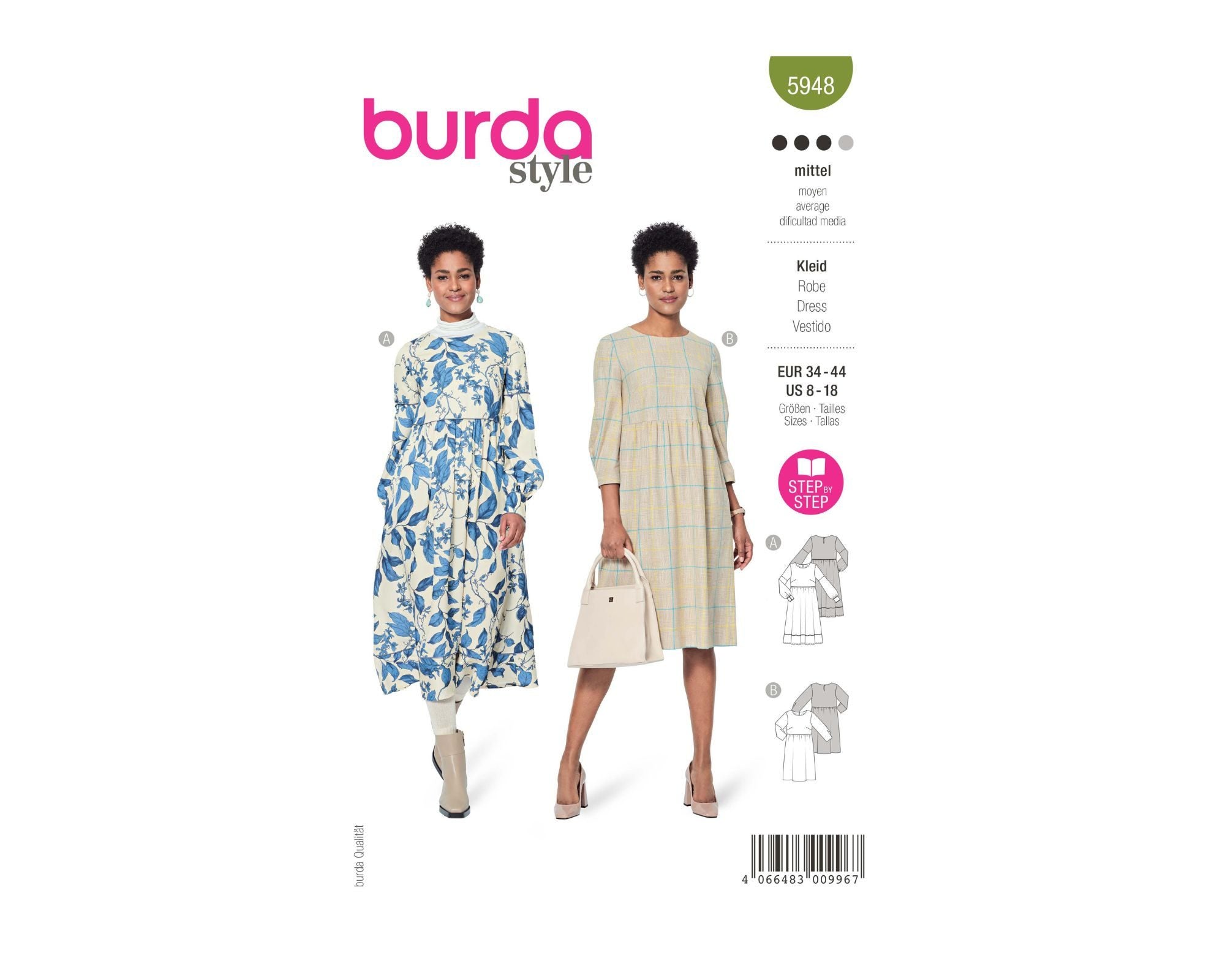 Anziehen und Wohlfühlen ist angesagt bei diesem Kleid mit hoch angesetztem Rockteil und rundem Ausschnitt mit Schlitz im Rückenteil. A wadenlang mit weiten Ärmeln, die mit Manschetten gebändigt werden. B ist kniekurz und hat einen schmaleren Ärmel mit Falten als Abschluss.