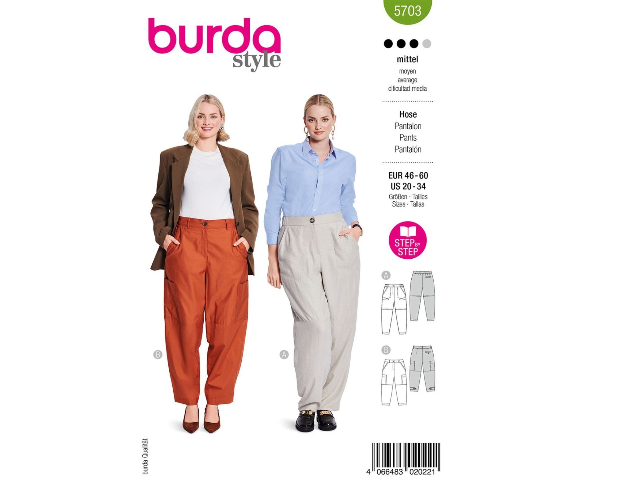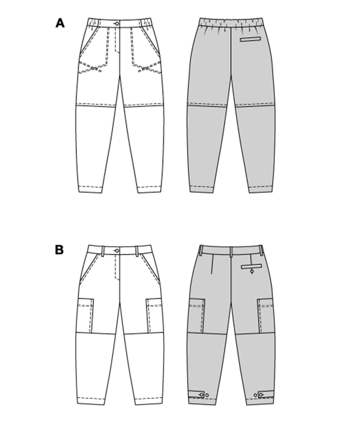 Diese beiden Hosen-Schnittmuster sind perfekt, wenn du schon etwas Näherfahrung hast. Die Cargohose überzeugt mit dezenten Steppungen und einem sportlich-eleganten Schnitt, der sowohl bürotauglich als auch lässig mit Sneakers gut aussieht. Der zweite Schnitt begeistert mit einer angesagten Barrel-Form, aufgesetzten Taschen und verstellbaren Riegeln am Saum – für einen individuellen Look. Beide Modelle bieten viele Gestaltungsmöglichkeiten!