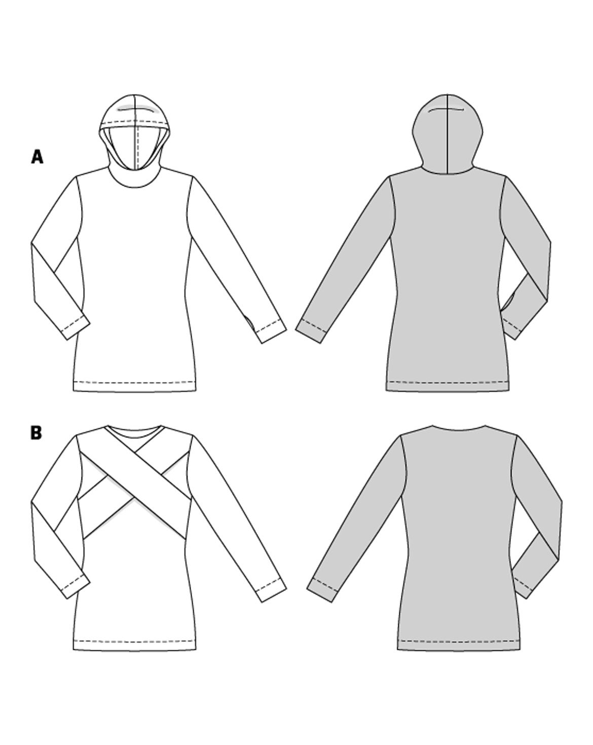 Entdecke unsere modernen Schnittmuster für Pullover und Shirt. Der Pullover kombiniert den lässigen Hoodie-Look mit einem femininen, körpernahen Schnitt. Kleine Daumenschlitze an den Ärmelbündchen sorgen für zusätzlichen Komfort – wer es dezenter mag, lässt sie einfach weg. Die zweite Variante beeindruckt mit überkreuzten Schnittteilen, die das schmale Shirt zum ech