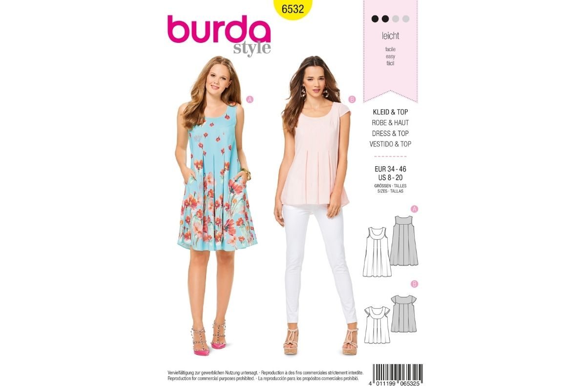 Kleid A ärmellos, in knieumspielender Länge. Top B in gleicher Schnittführung mit kleinen Kappenärmeln, die die Schultern schön bedecken.