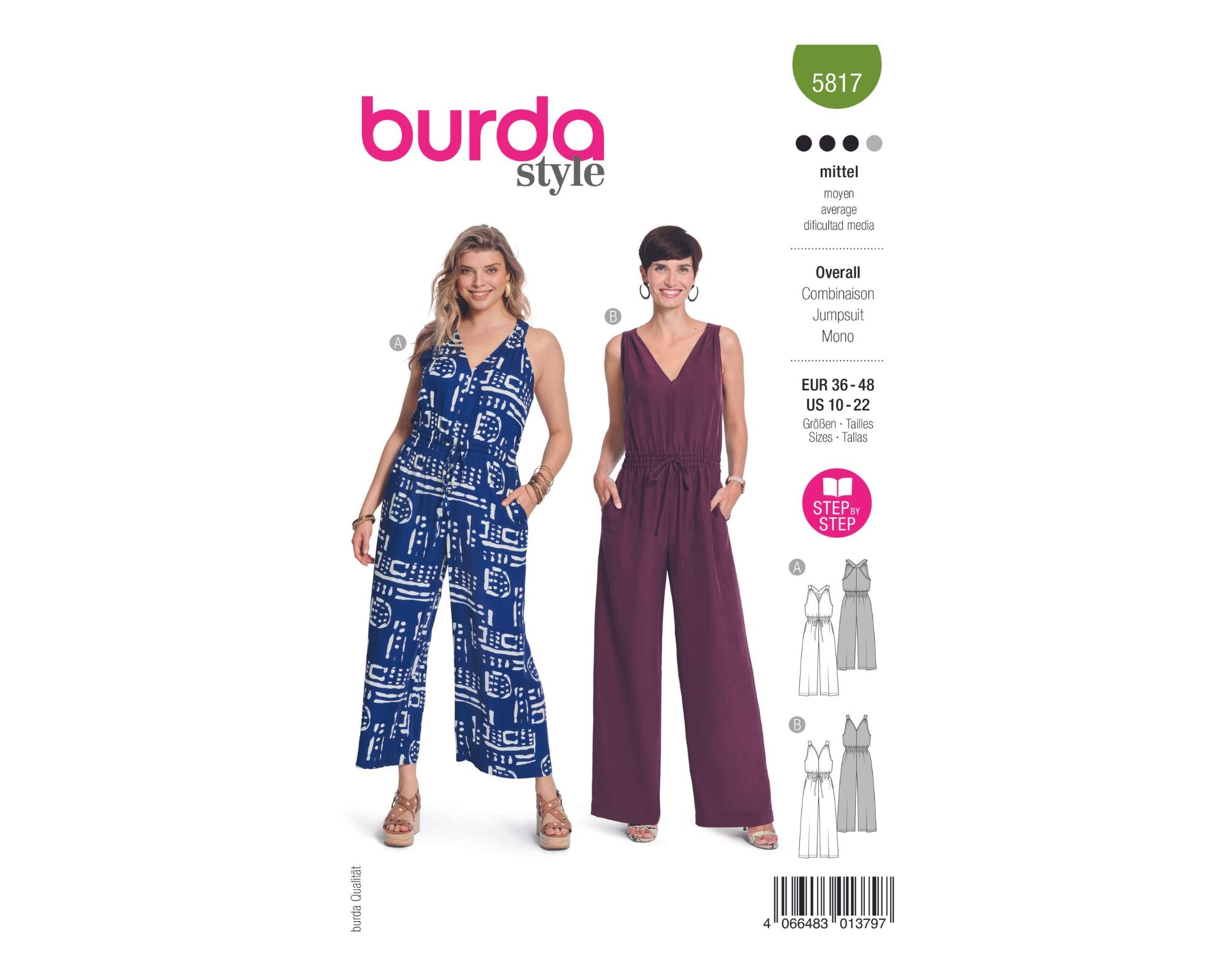 Schnittmuster-Set mit zwei stilvollen Jumpsuits: nähe mit burda style einen praktischen Overall mit tiefem V-Ausschnitt und Taschen oder einen eleganten Seidenjumpsuit mit Kräuselträgern und Tunnelzug für vielseitigen Stil - beides auf Nählevel 3. Zwei Must-Have-Schnitte in einem Set!