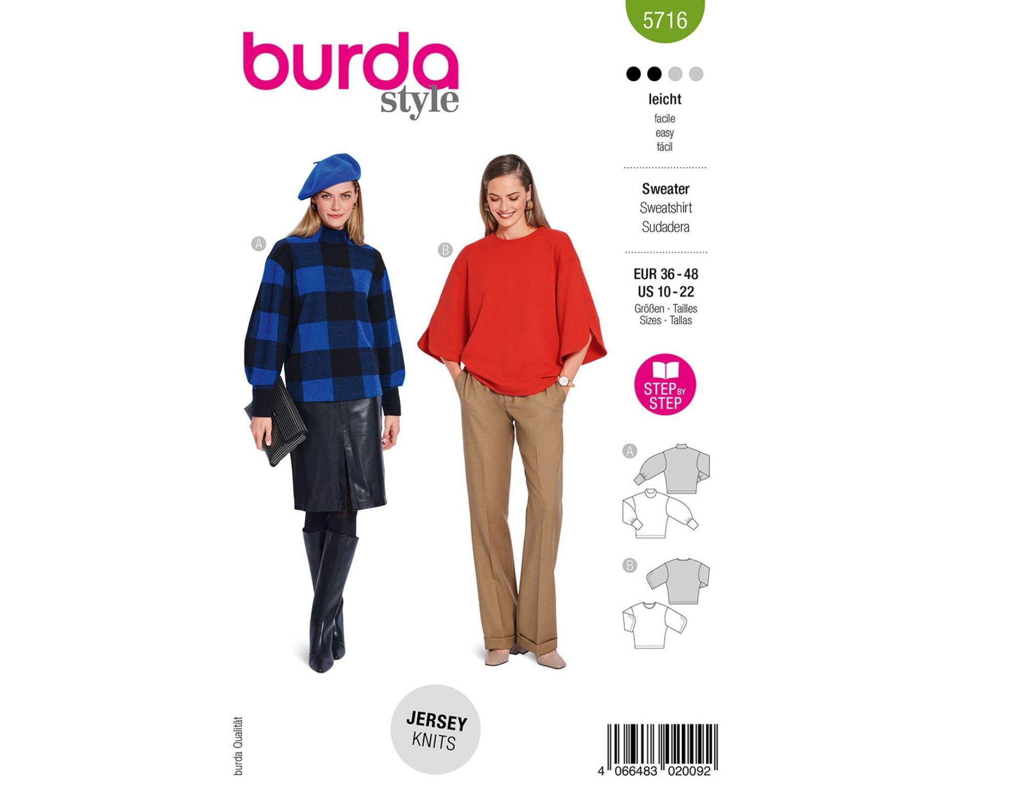 Entdecke zwei trendige Sweatshirt-Varianten in einem Schnittmuster! Variante 1 besticht durch supervoluminöse Ärmel und lange, schmale Bündchen – bequem und stylisch zugleich. Schnitt-Variante 2 bringt mit abgerundeten Säumen und weitem Schnitt frischen Wind in deinen Kleiderschrank. Nähe beide Looks aus Strickstoff, Sweatshirtstoff oder Jerseystoff!