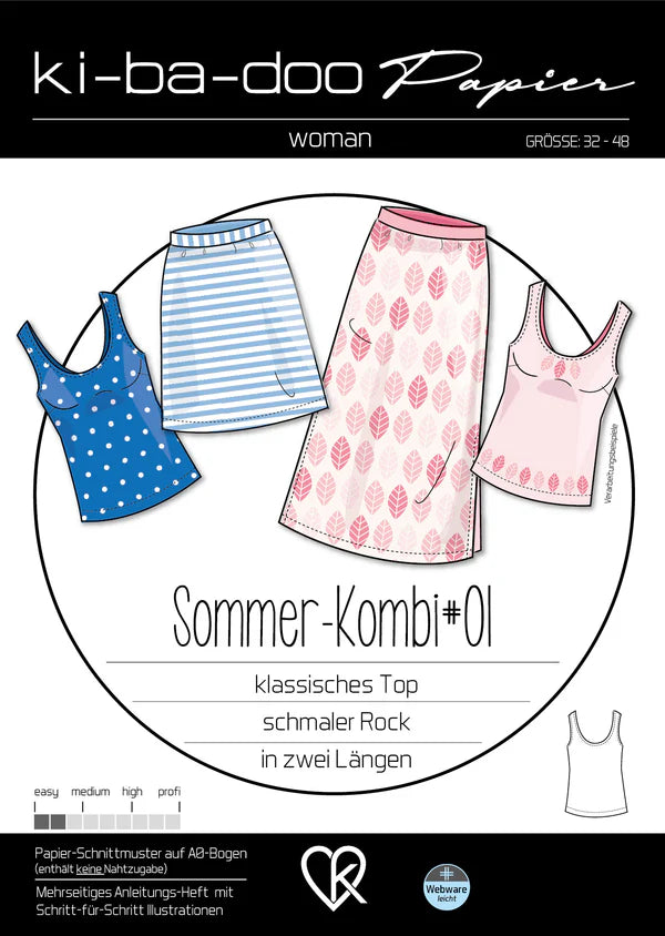 Diese Sommer-Kombi enthält das Träger-Top mit schlankem Rock, der seitlich geschlitzt ist. Der Rock ist in zwei Längen verfügbar. Zusätzlich enthält der Schnitt noch zwei Bund-Varianten, um den Rock auch solo tragen zu können: einmal die klassische schmale Variante und einmal den sportiven Bund mit Drei-Tunnel-System.