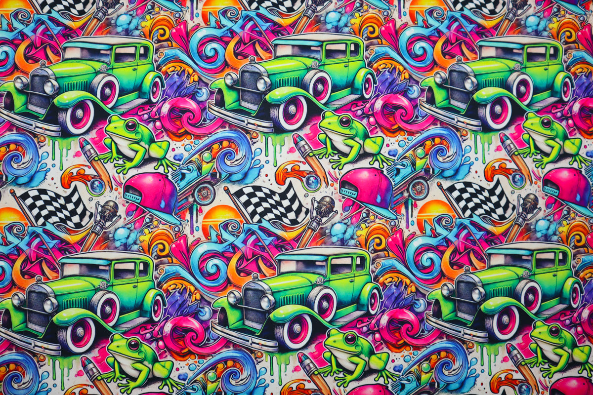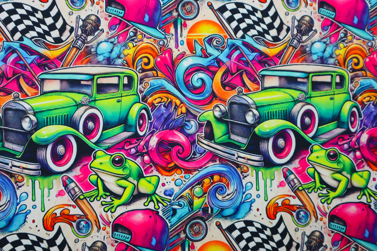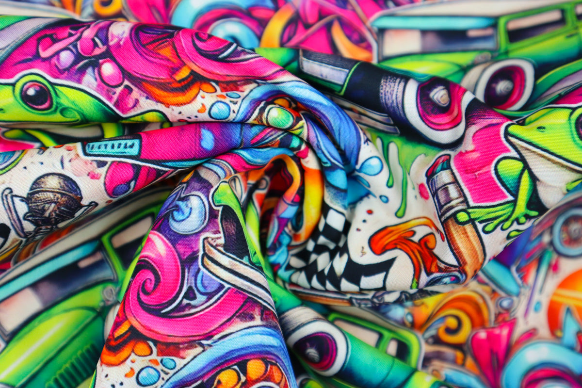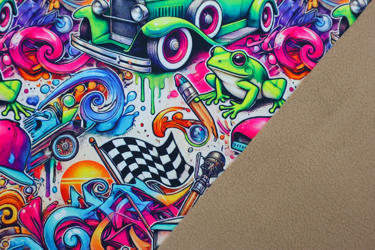 Auf diesem Stoff ist mächtig was los - viele kleine Motive, von Caps, Flaggen, Stiften über Graffiti und Mikrofone.