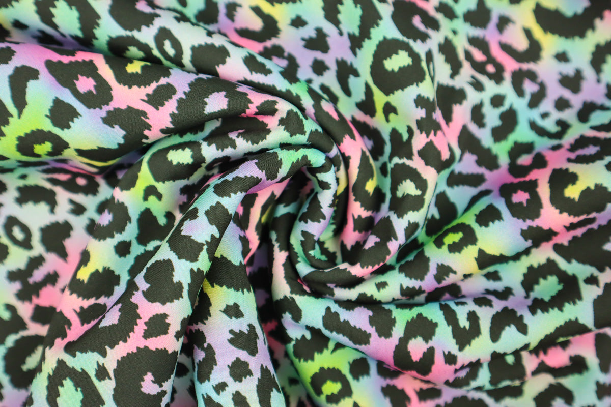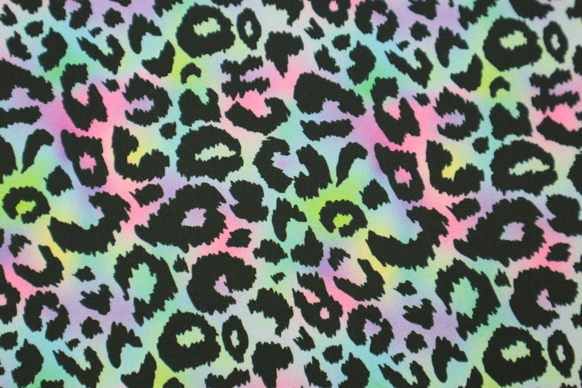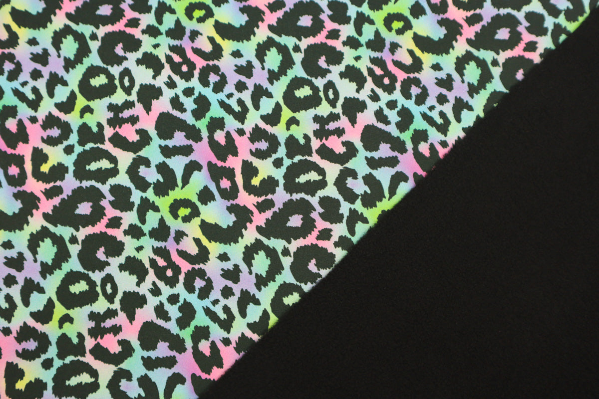 Angesagtes, schwarzes Leo Muster auf Batik Regenbogen Hintergrund.