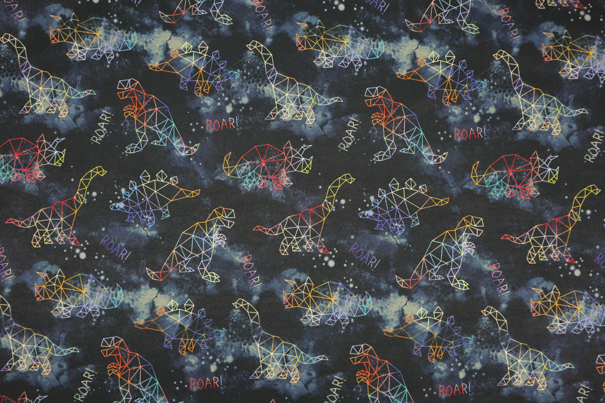 Cooles Muster mit bunten, grafischen Dinos auf galaktischem Hintergrund.