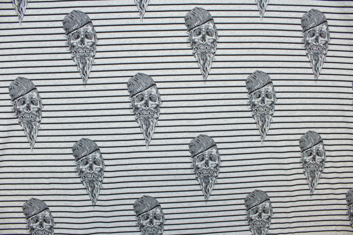 Angesagtes Muster mit coolen Hipster Totenköpfen auf gestreiftem Hintergrund.