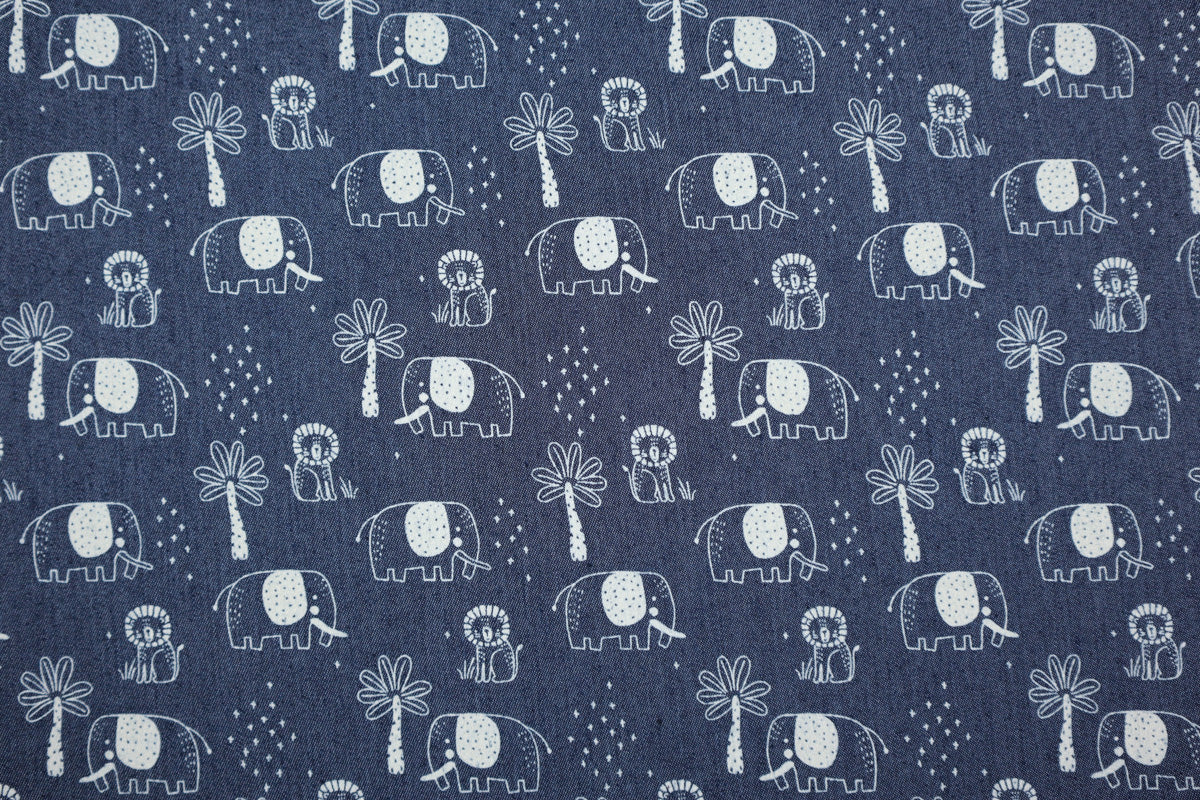 Leichter Denim Jeansstoff mit kleinen Löwen und Elefanten zwischen Palmen und kleinen Punkten.
