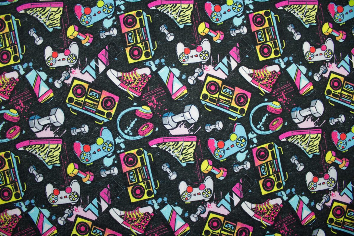 Angesagter Sweatshirtstoff mit coolem Muster - Sneakers, Playstation, Musicplayer - alles für coole Kids.