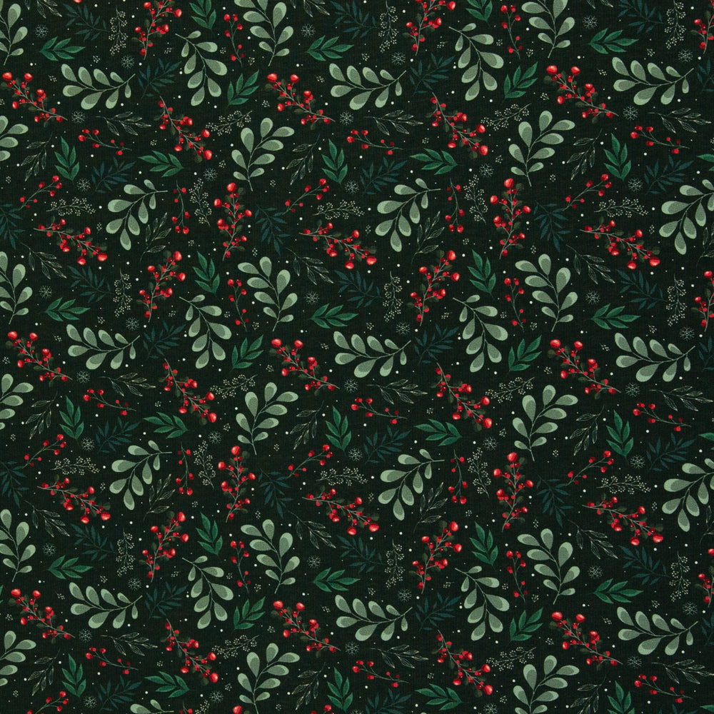 Misteln und rote Beeren: Der klassische Winterzweigprint auf Dunkelgrün sorgt für festliche Eleganz und macht sich sowohl in Mode als auch in Home-Deko hervorragend.