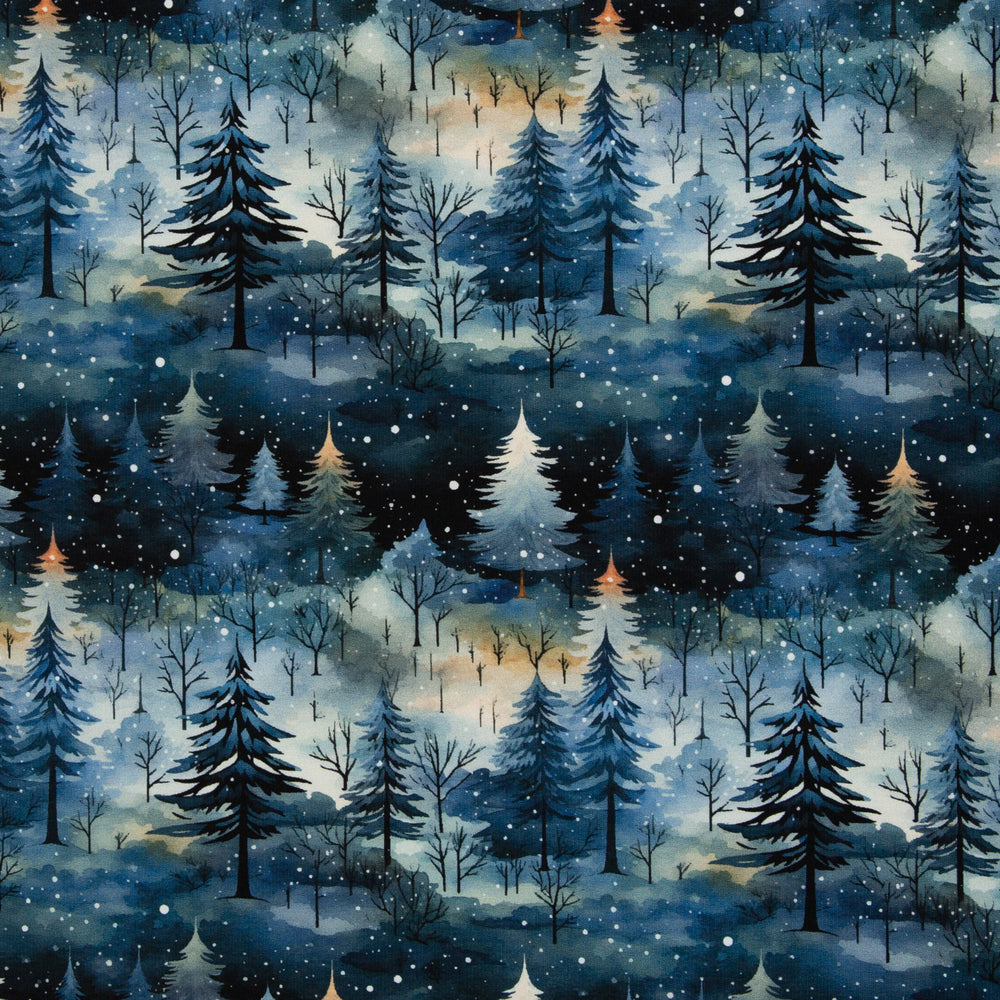 Winterliche Waldlandschaft: Schneebedeckte Bäume und ein verträumter Nachthimmel in Aquarell-Optik – ideal für festliche Outfits mit ruhiger, edler Anmutung.