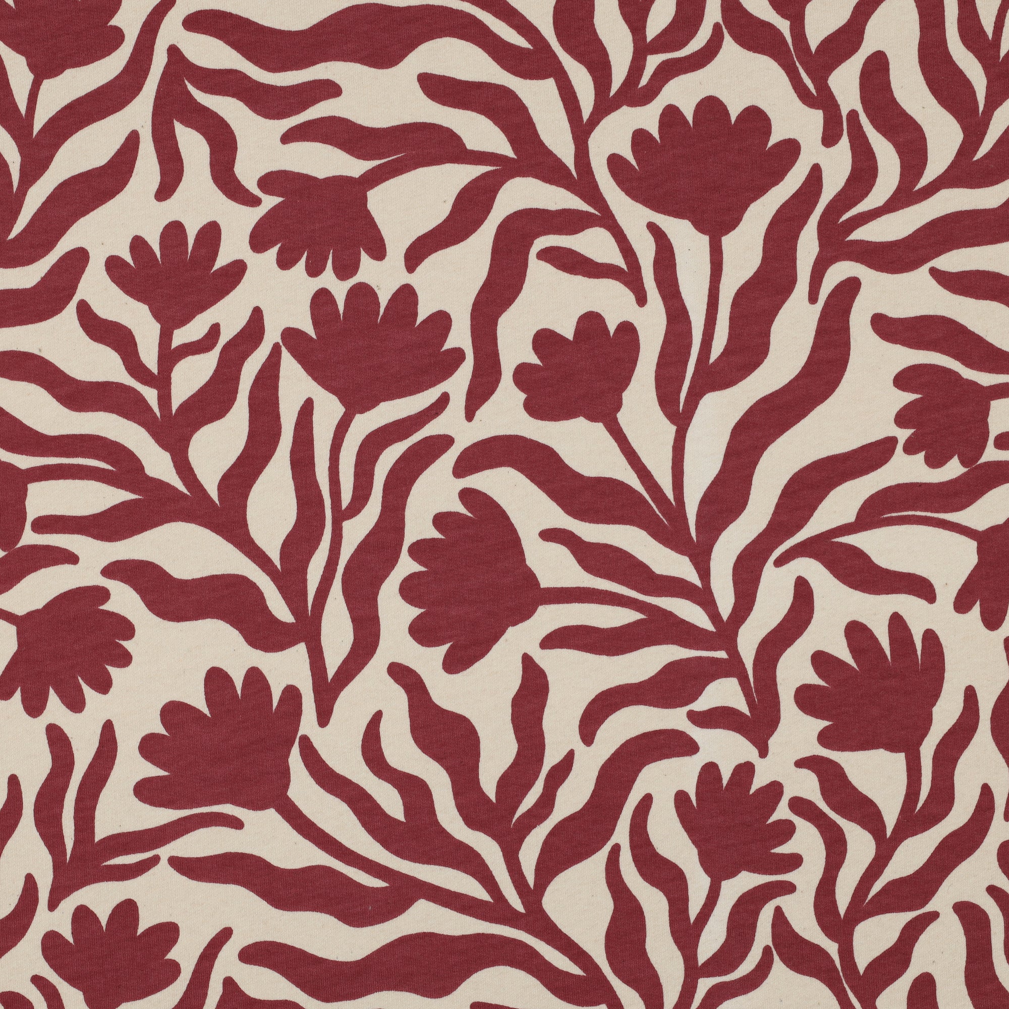 Kuschelig weicher, innen angerauter Sweatshirtstoff mit bordeaux-farbenem Blumenmuster.