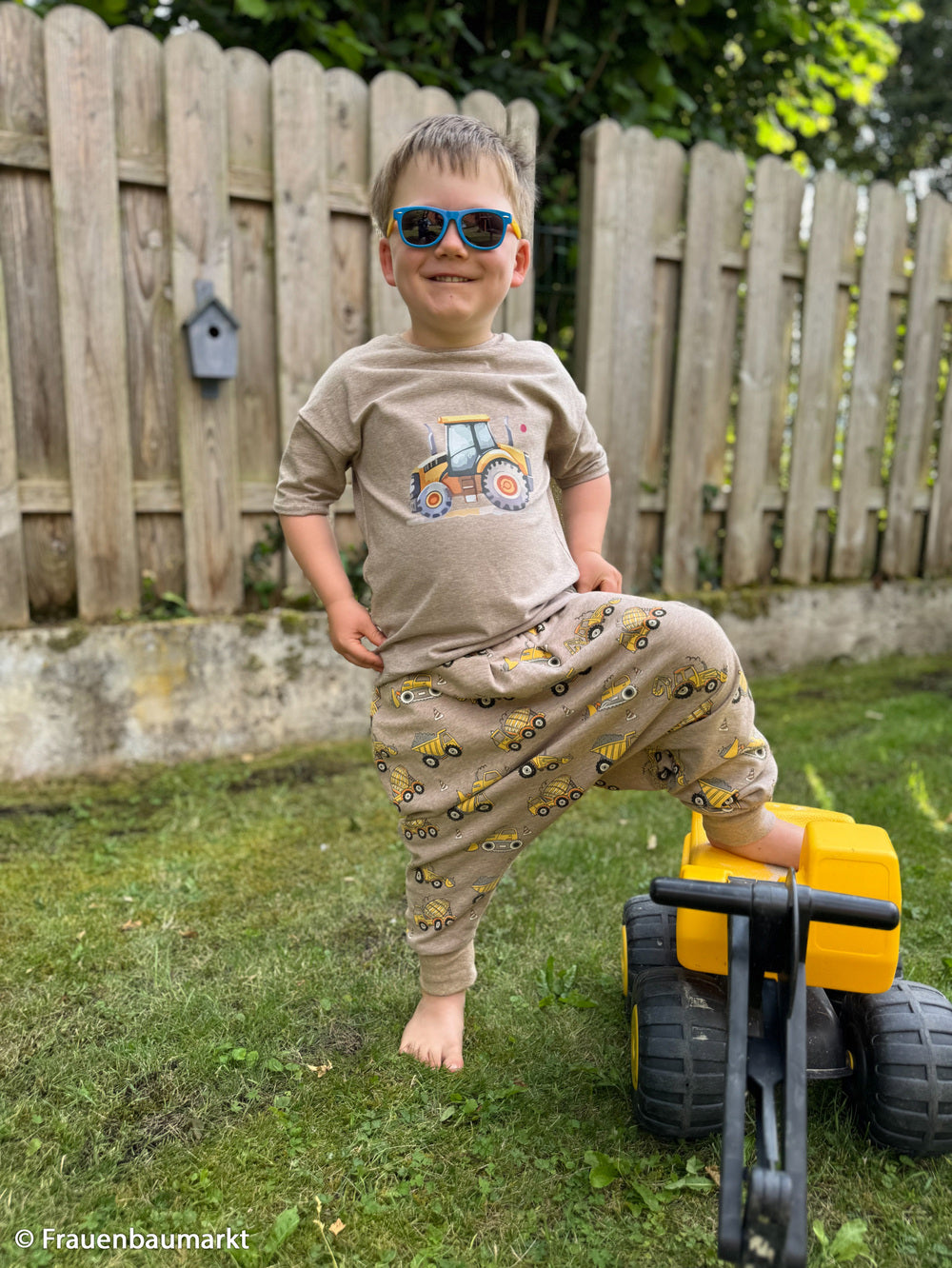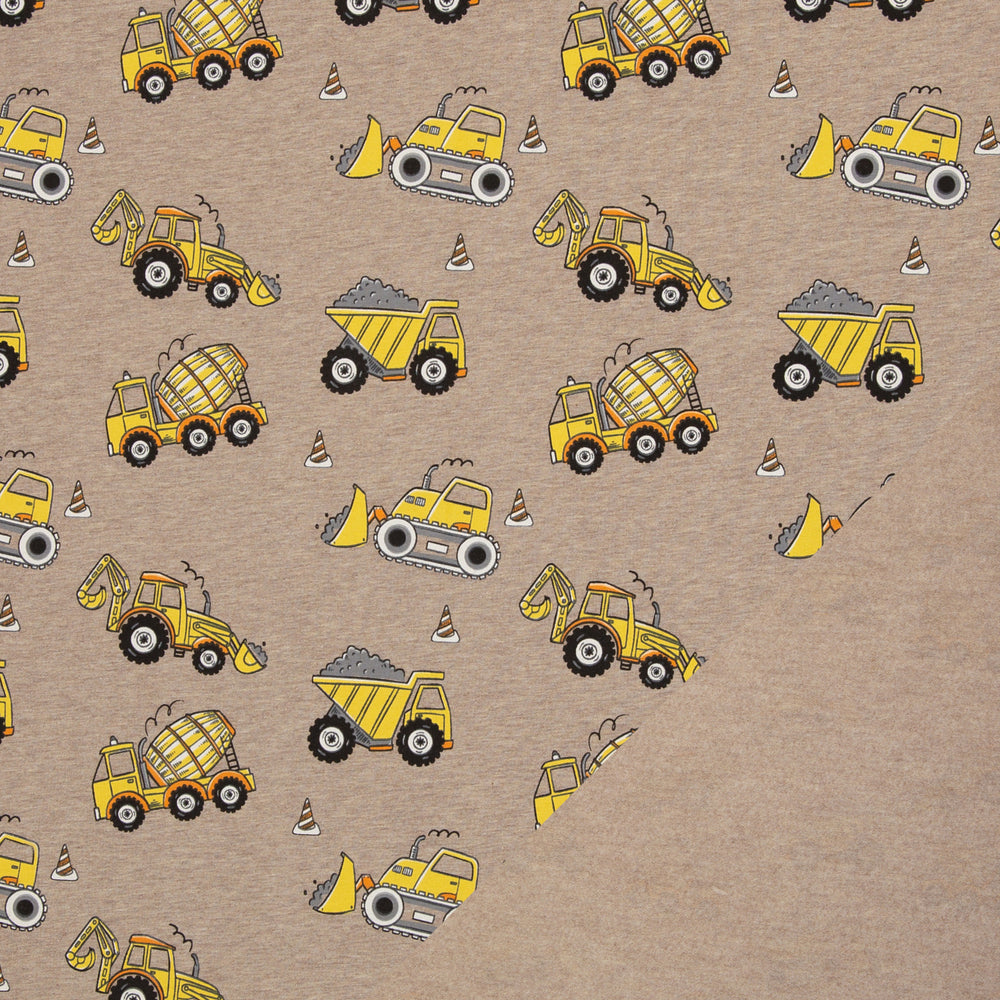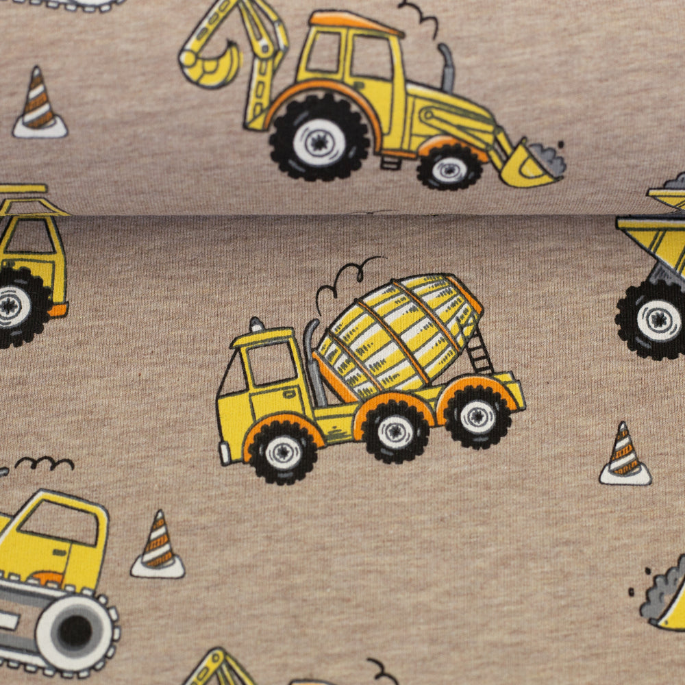 Nick ist ein angerauter Sweat mit Baufahrzeugen auf der beliebten Eike-melange-Qualität mit kindgerechten Druckmotiven.