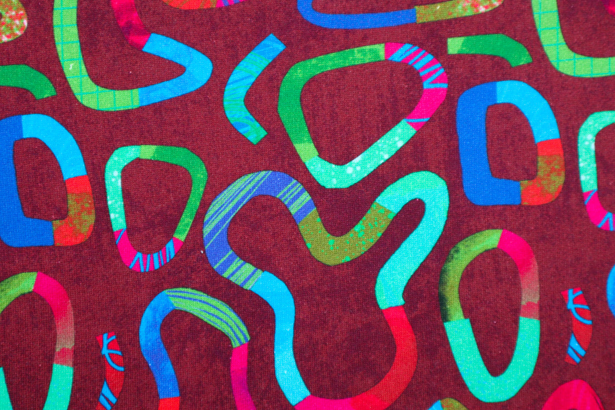 Toller Sweatshirtstoff mit bunt gemustertem Design auf dunkelrotem Hintergrund und kuschlig weicher, weißer, angerauter Innenseite.