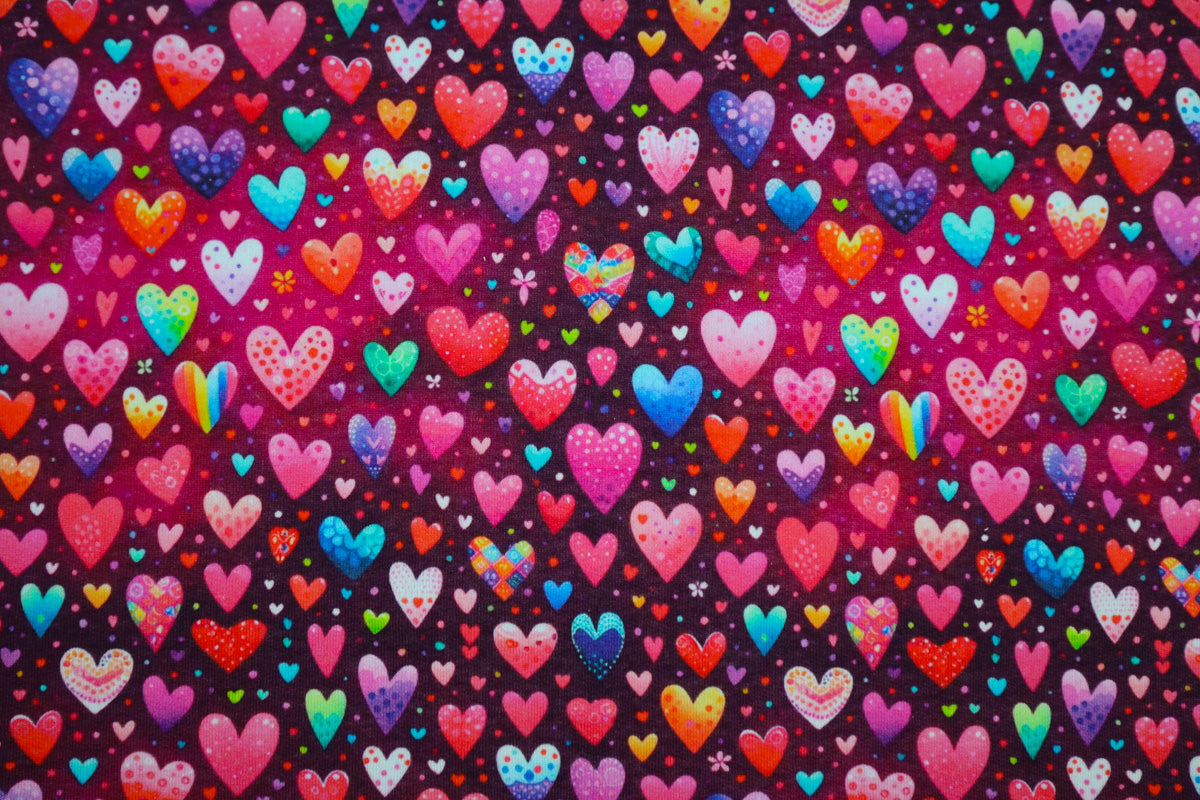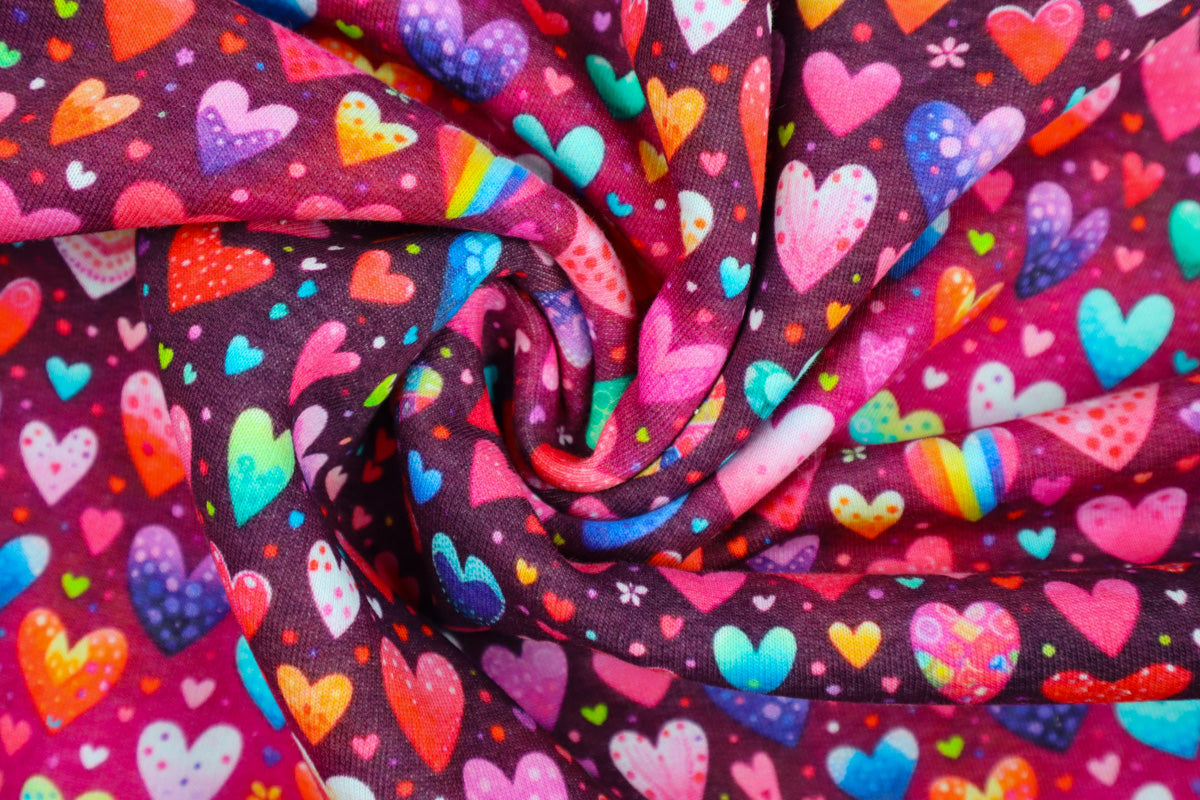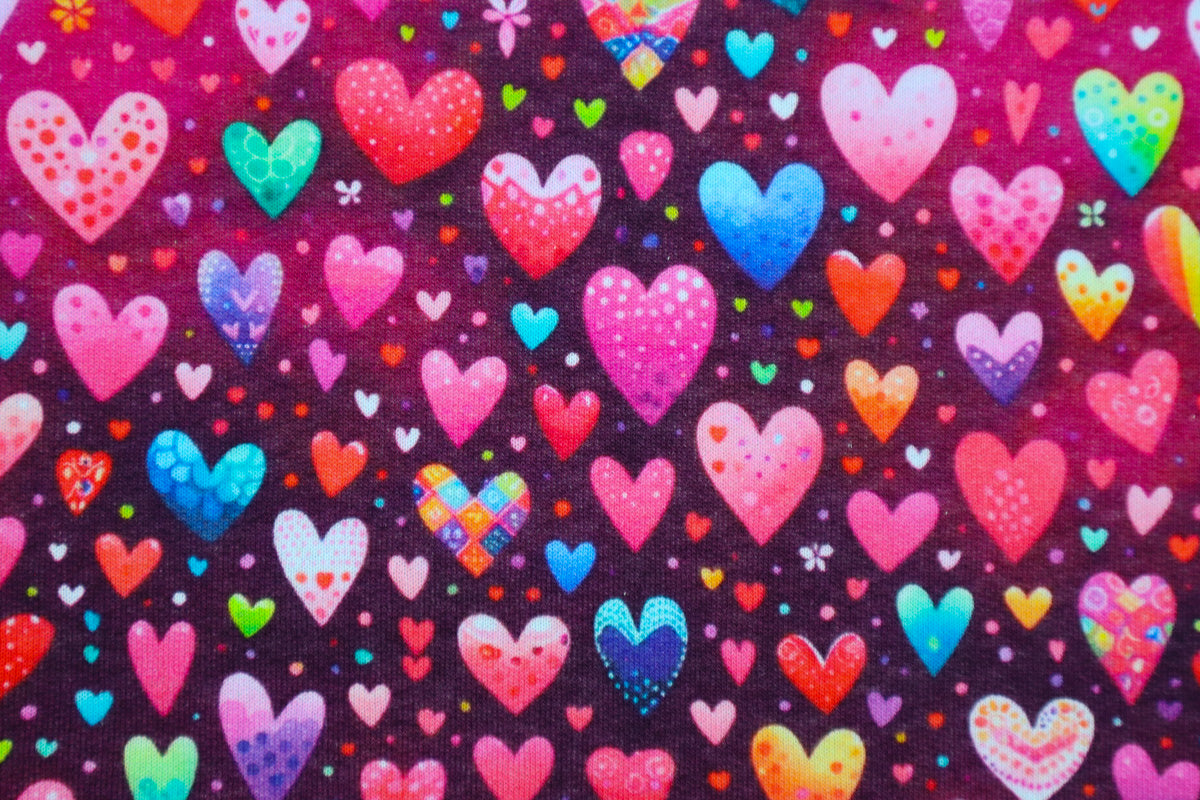 Verschieden gemusterte, bunte Herzen auf beerefarbenem Hintergrund.