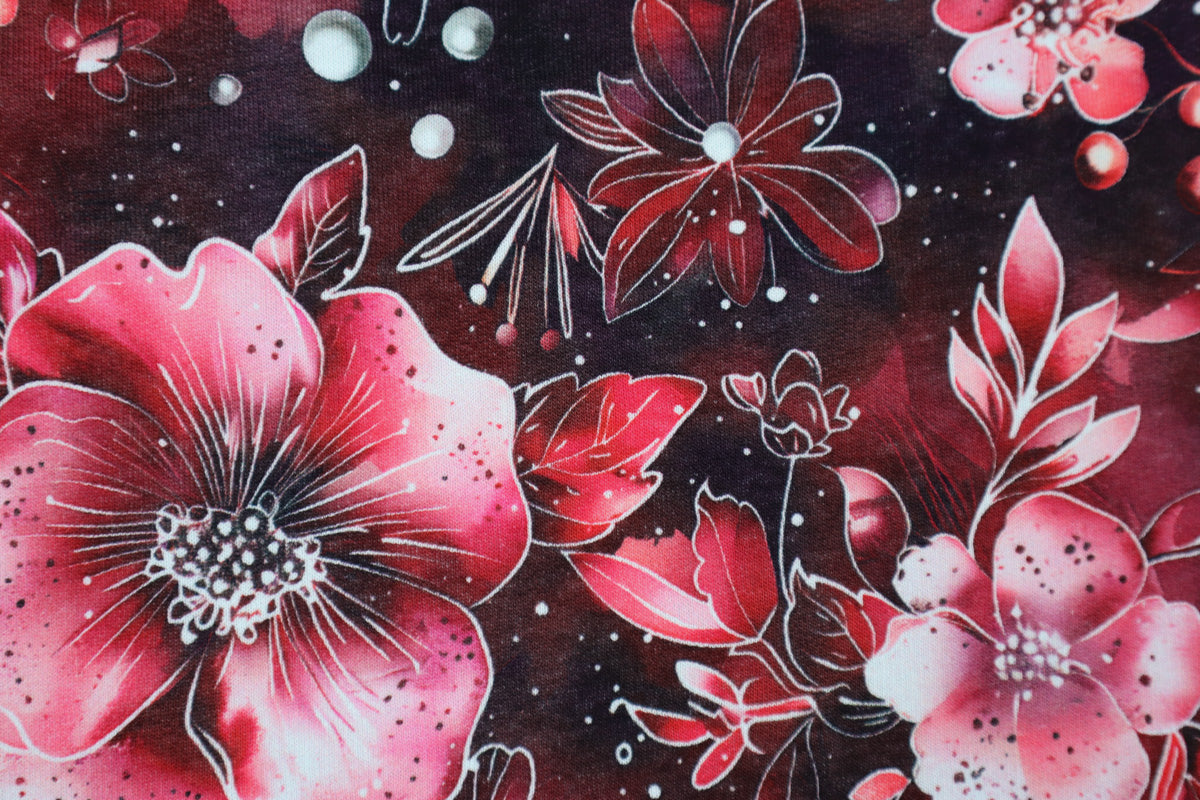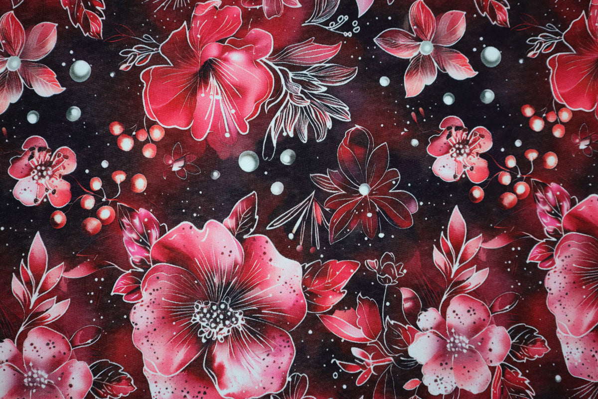 Schönes Blumen- Blütenmuster auf weinrotem Hintergrund.
