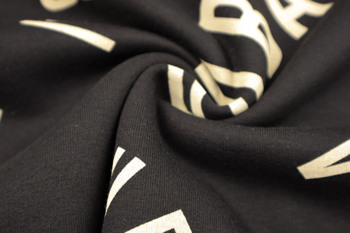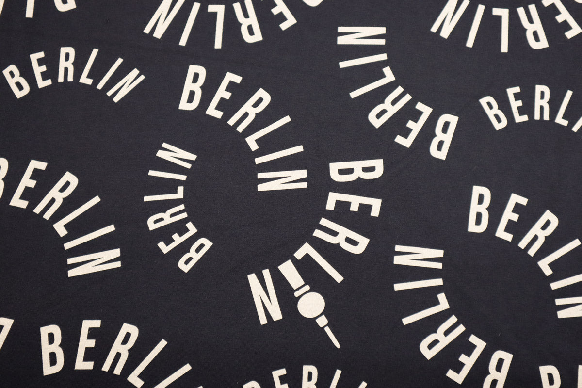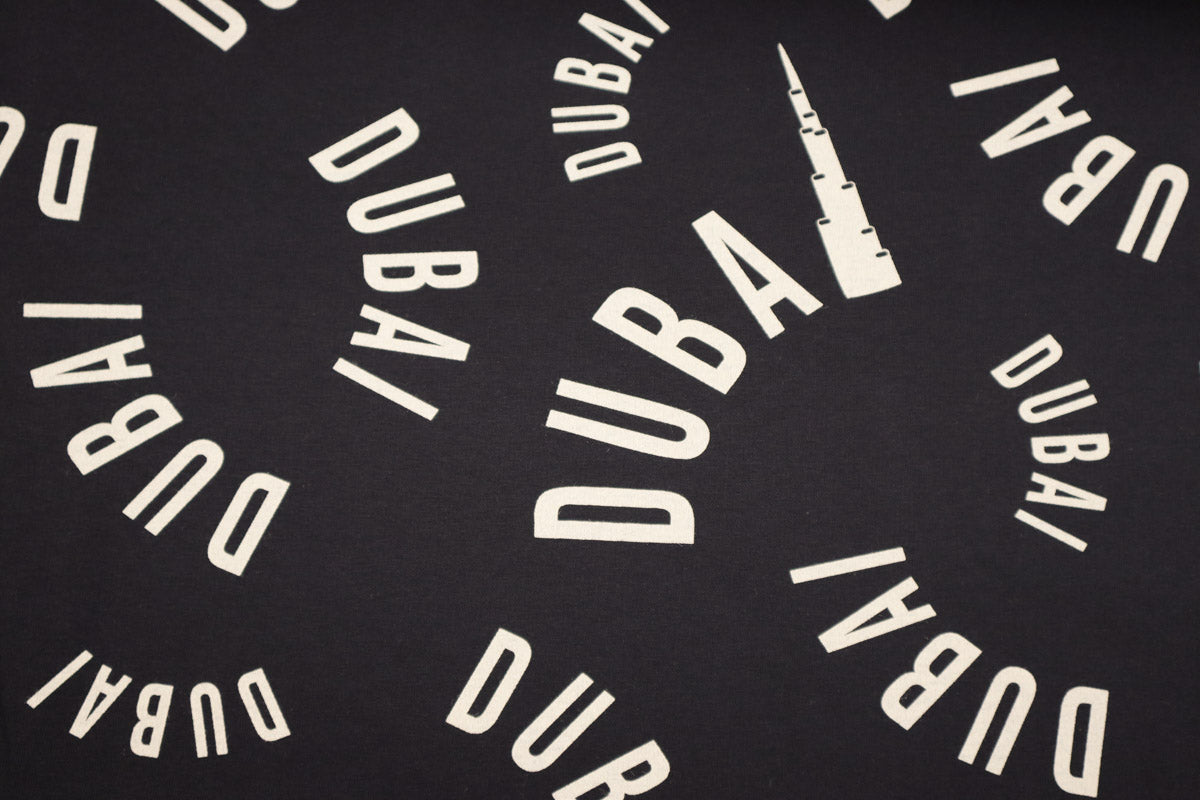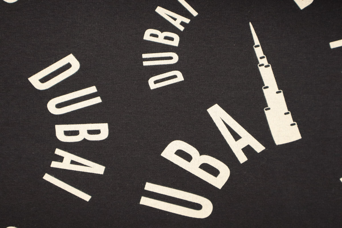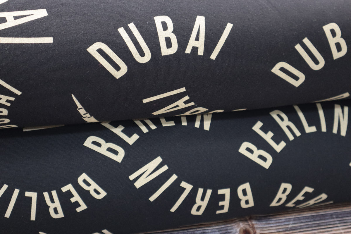 Schwerer Jogging-Stoff, der weiche Bio-Baumwolle mit der Strapazierfähigkeit von recyceltem Polyester kombiniert - eine komfortable und umweltfreundliche Wahl für neue Kleidung. Das coole Design mit den beigen Motiven der Metropolen Berlin und Dubai verleiht dem schwarzen Stoff ein urbanes und modernes Flair. Die Abseite des Stoffes ist schwarz.