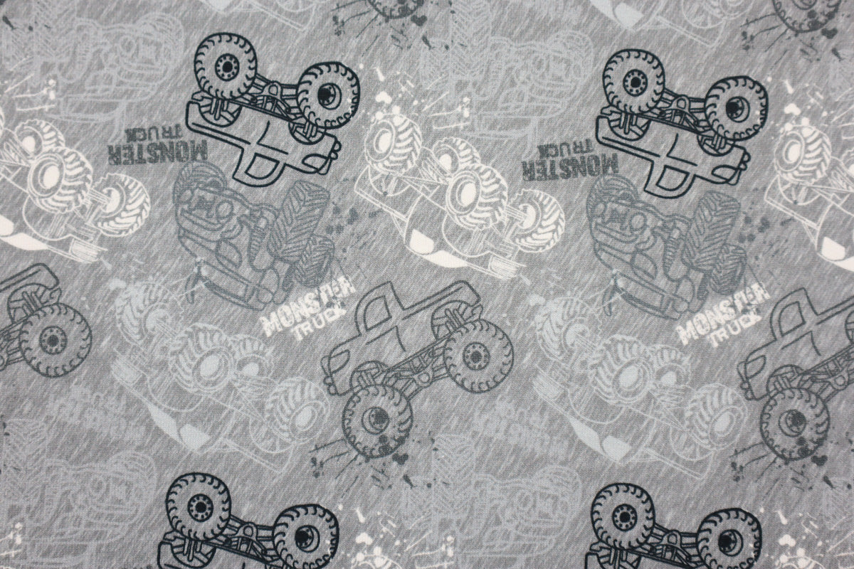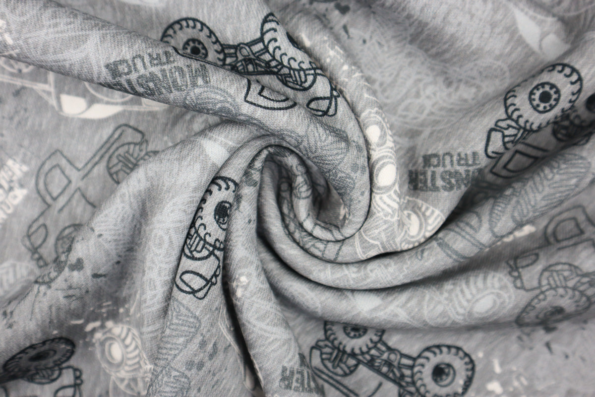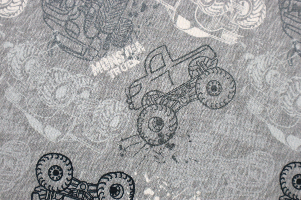 Angesagtes Muster mit verschiedenen Monster Trucks auf grau meliertem Hintergrund und weißer, kuschlig angerauter Innenseite.