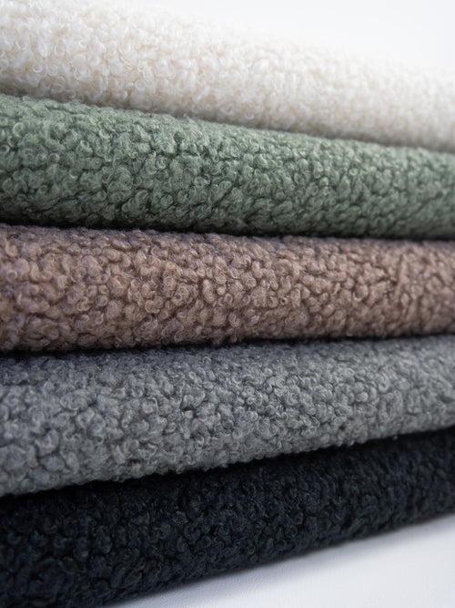Der gelockte Boucle-Stoff kommt aus der Polsterindustrie und ist mit > 80.000 Martindale-Touren sehr robust und scheuerfest.