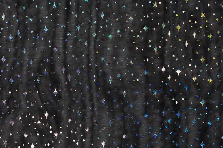Der schwarze Feintüll ist mit silberfarbenen, schillernden Sternen aus Hologrammfolie versehen.