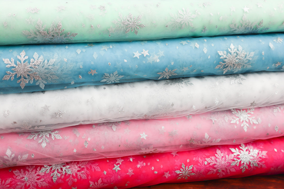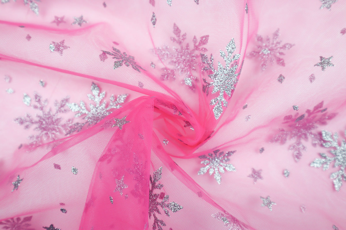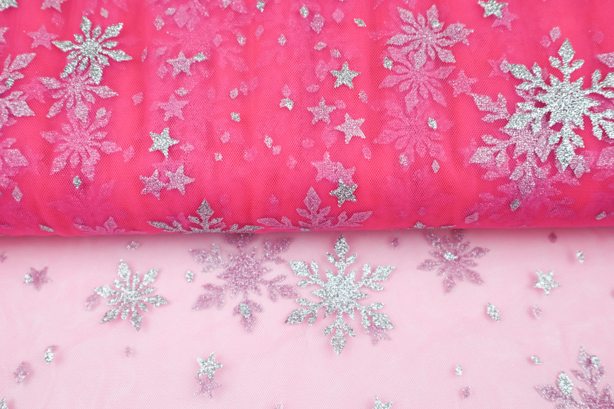 Der traumhaft weiche Tüll ist mit silberfarbenen, schillernden Schneeflocken versehen.