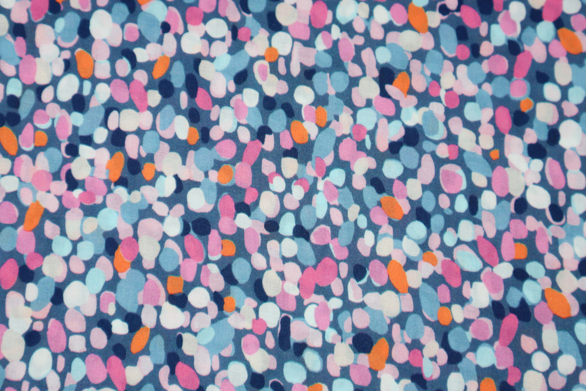 Luftig leichter Viskosestoff mit buntem Tupfen-Muster auf rauchblauem Hintergrund.