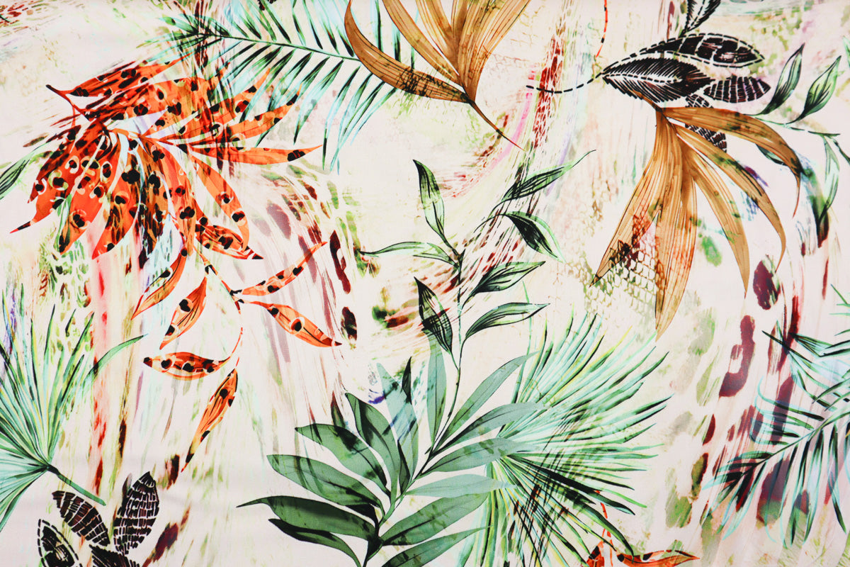 Wunderschöner Viskose-Stretch Twill mit buntem Blätter Muster.