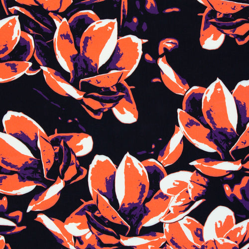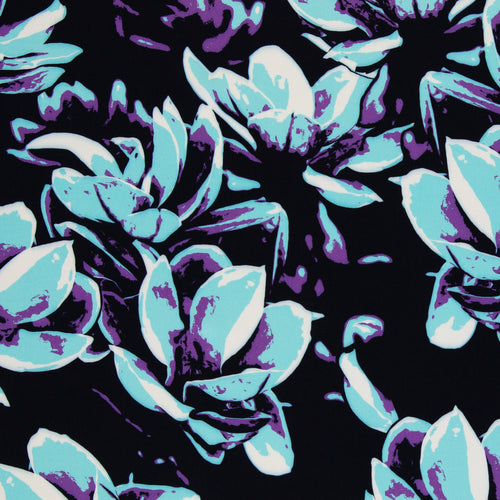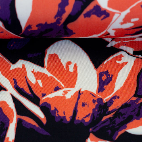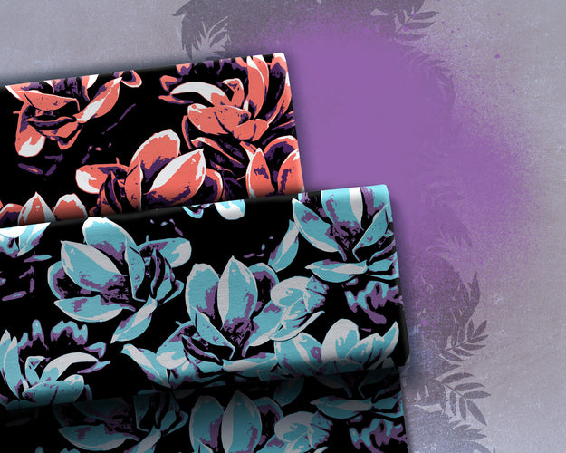 Die streetartigen Blüten gibt es in zwei trendigen Farbvarianten und lassen sich auf der griffigen Viskosequalität ideal für luftig leichte Kleider, Röcke, Blusen, Hosen, Tücher, etc. vernähen.