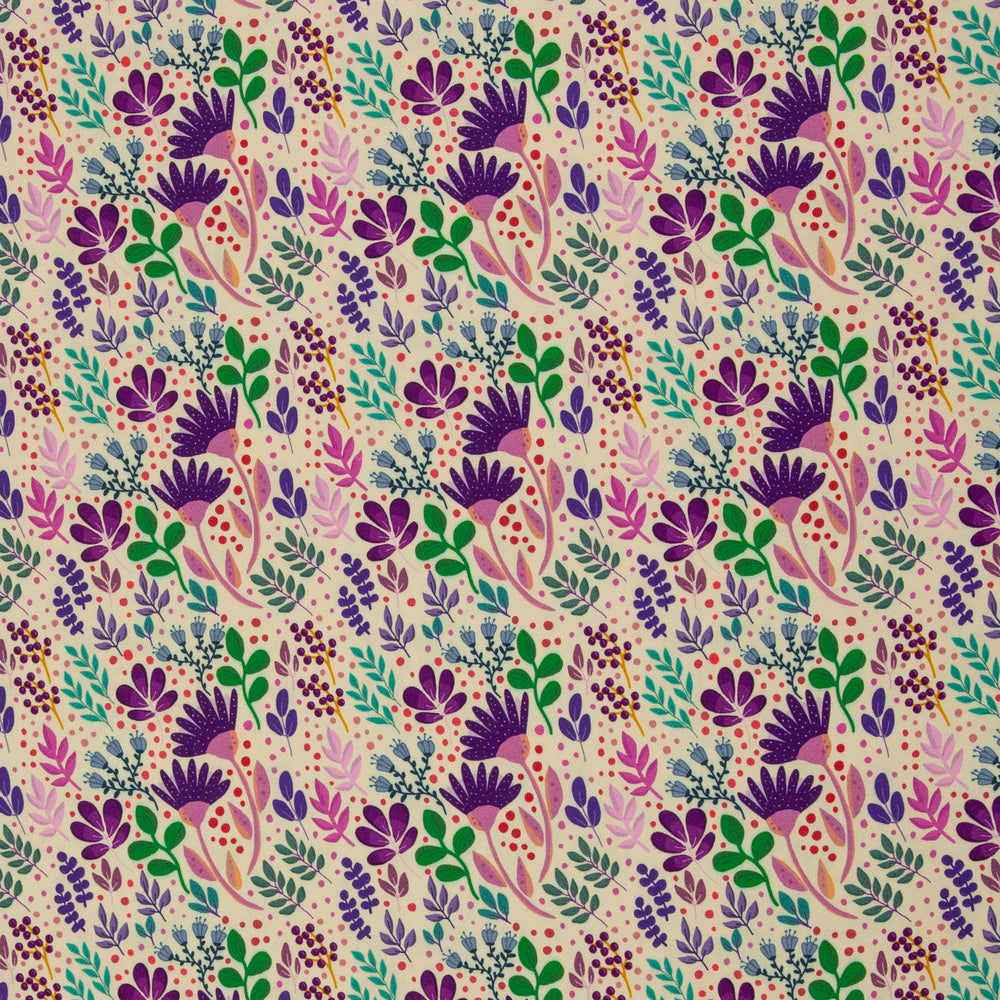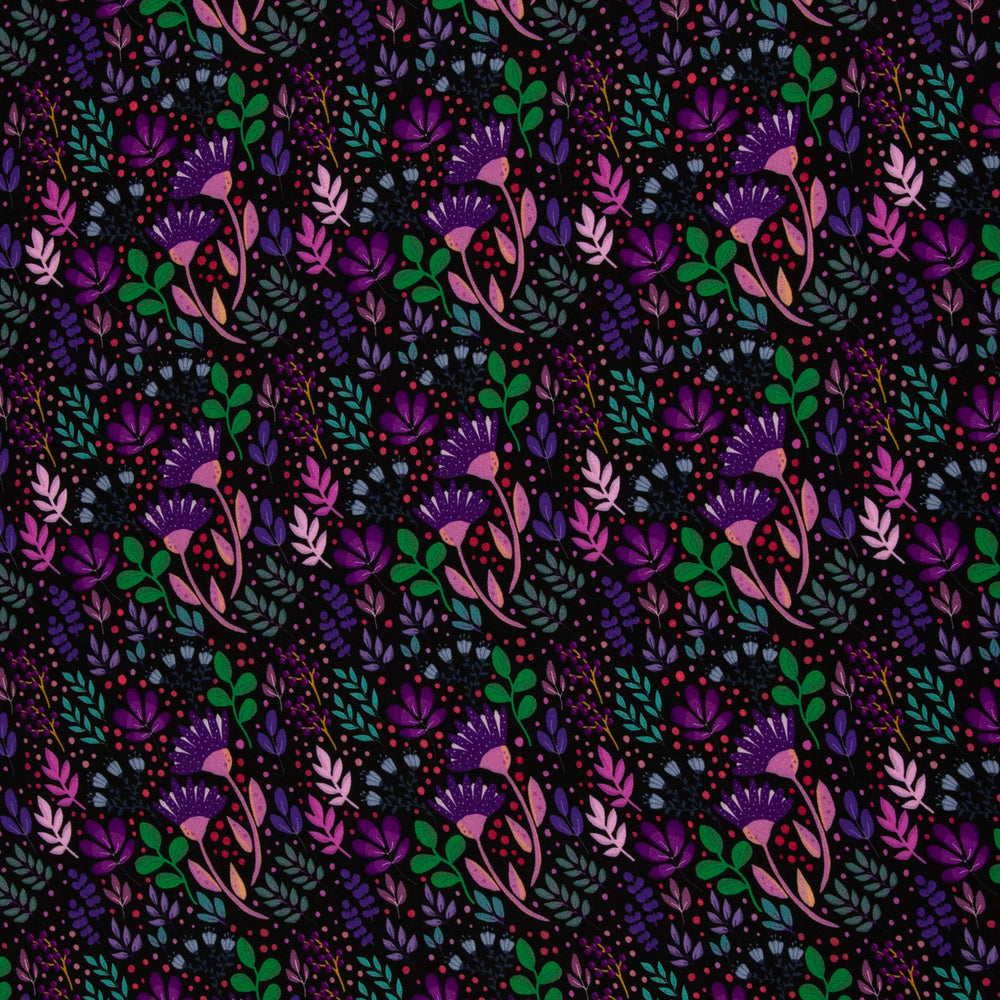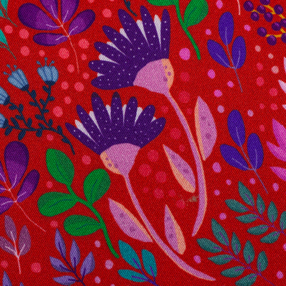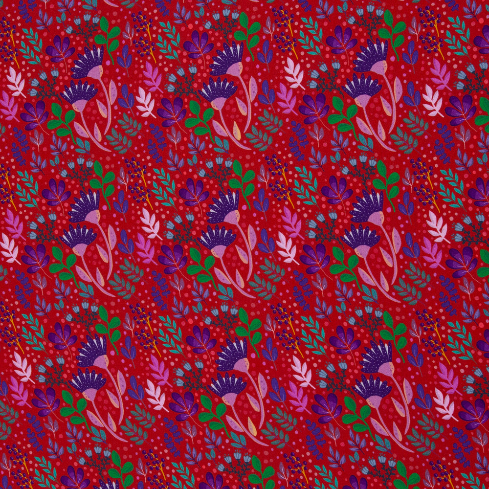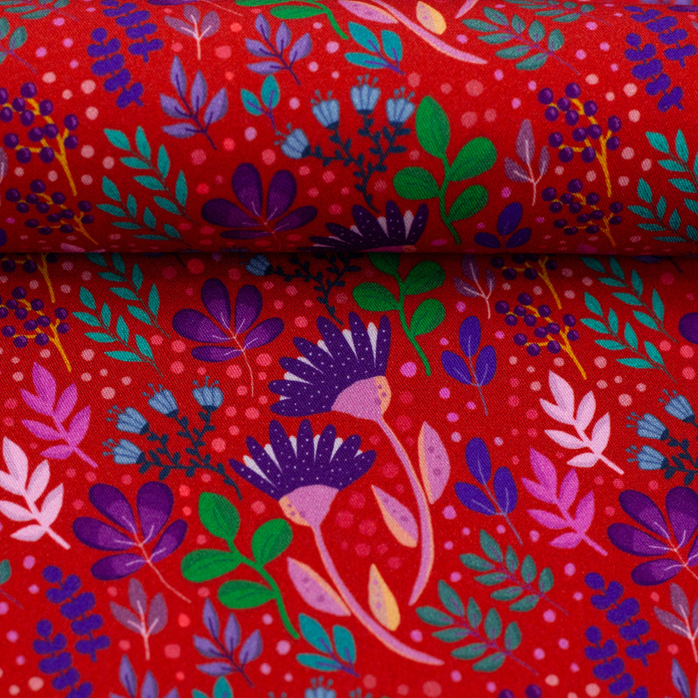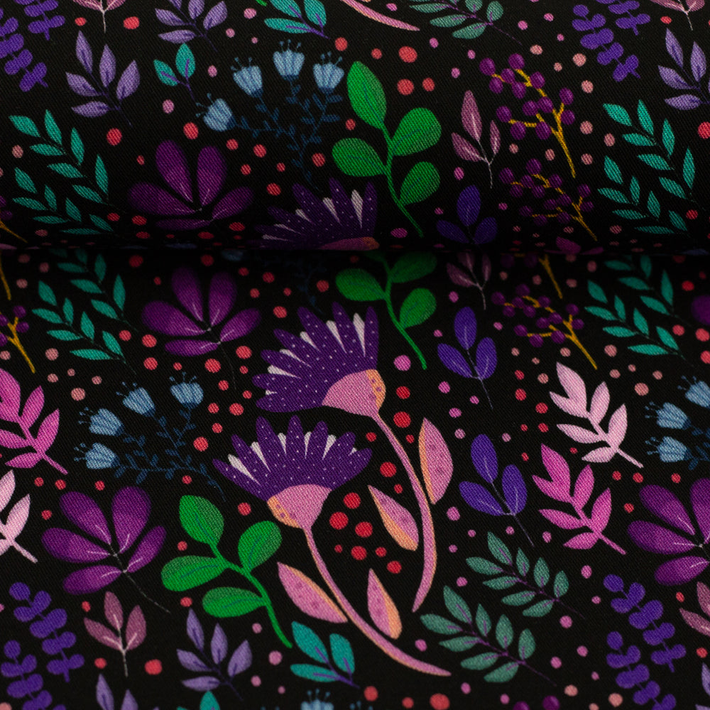 Das schöne, florale Muster gibt es in drei Farben – die bunten, aber dezent und sehr harmonisch abgestimmten Blumen leuchten auf dem Hintergrund in den Farben Naturweiß, Tiefschwarz und auf einem wunderschönen Kirschrot.