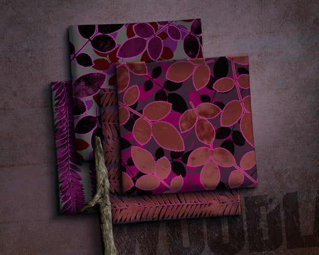 Gedeckte Trendfarben der Saison gepaart mit knalligen Farbakzenten und dem „Wood Block Stempel-Look“ machen aus diesen Blätter-Designs etwas Besonderes.