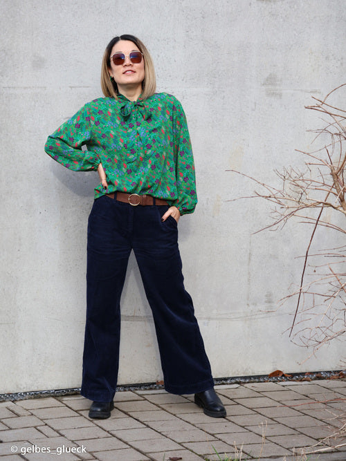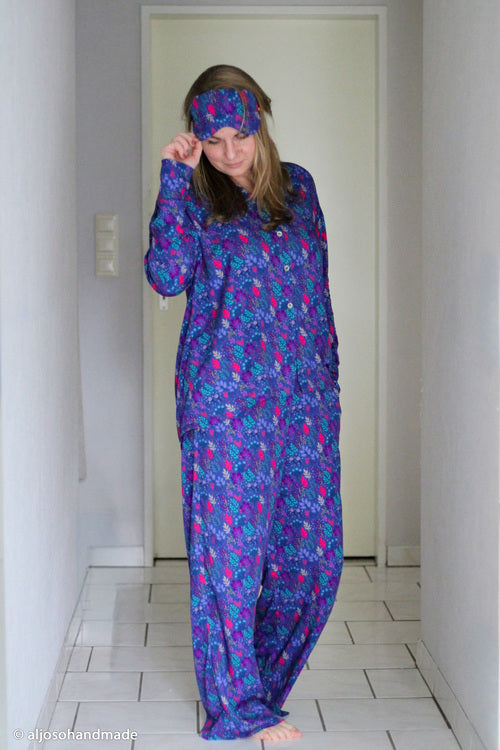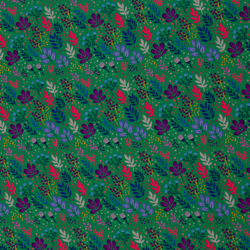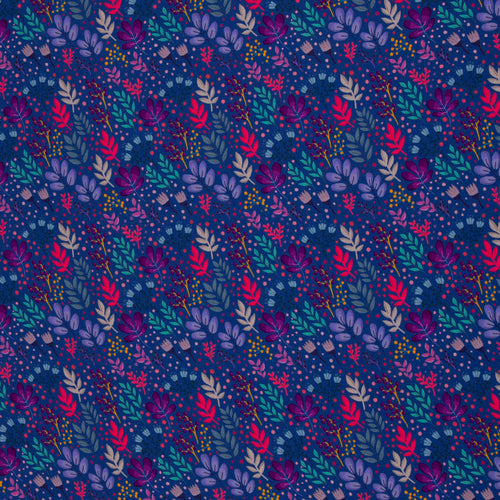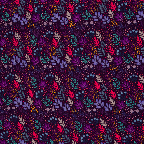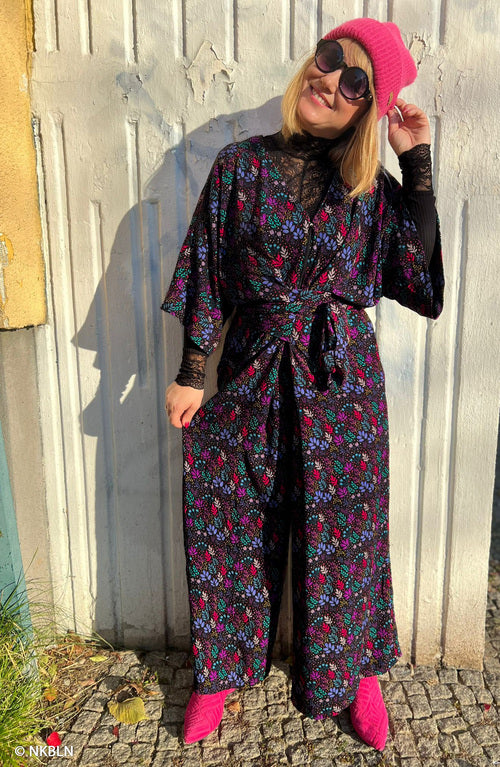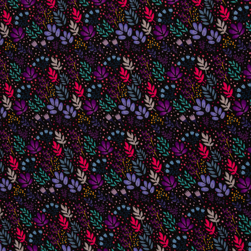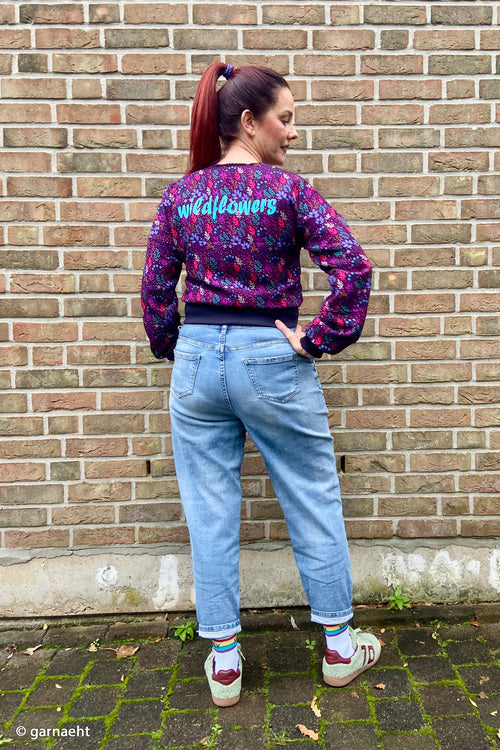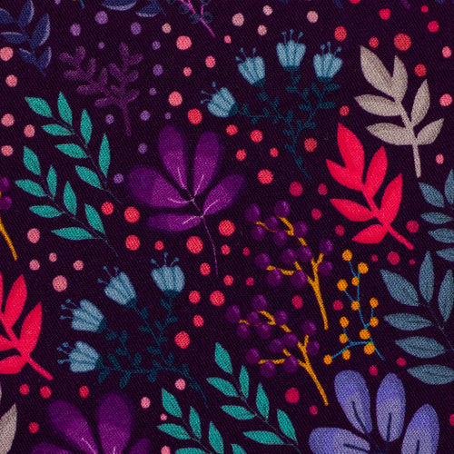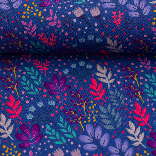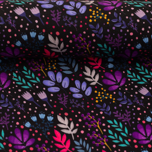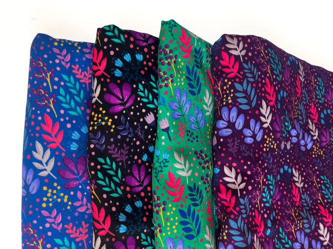 Die Wildflowers blühen auf Viskosewebware in vier Farben: Es gibt bunte Wildblumen auf Grün, auf Royalblau, auf einem schönen Violett/Aubergine und auf schwarzem Grund, der die Farben ganz besonders zum Strahlen bringt!