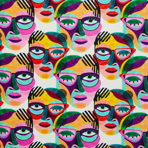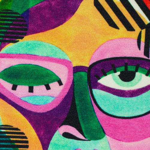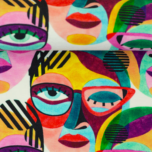 Ein modernes, künstlerisches Muster mit abstrahierten Gesichtern in kräftigen Farben wie Pink, Gelb und Grün – perfekt für auffällige und kreative Kleidungsstücke.
